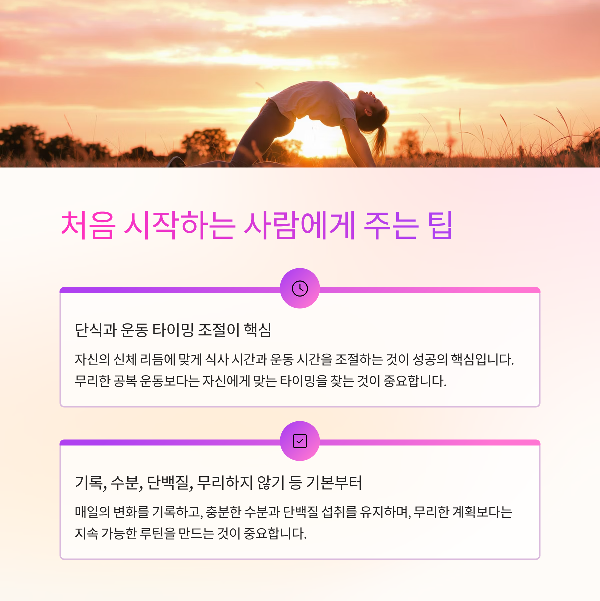 1. 단식 시간과 운동 시간을 겹치지 않도록 조절하세요. 초보자는 식후 1~2시간 후 운동이 가장 안정적입니다.
