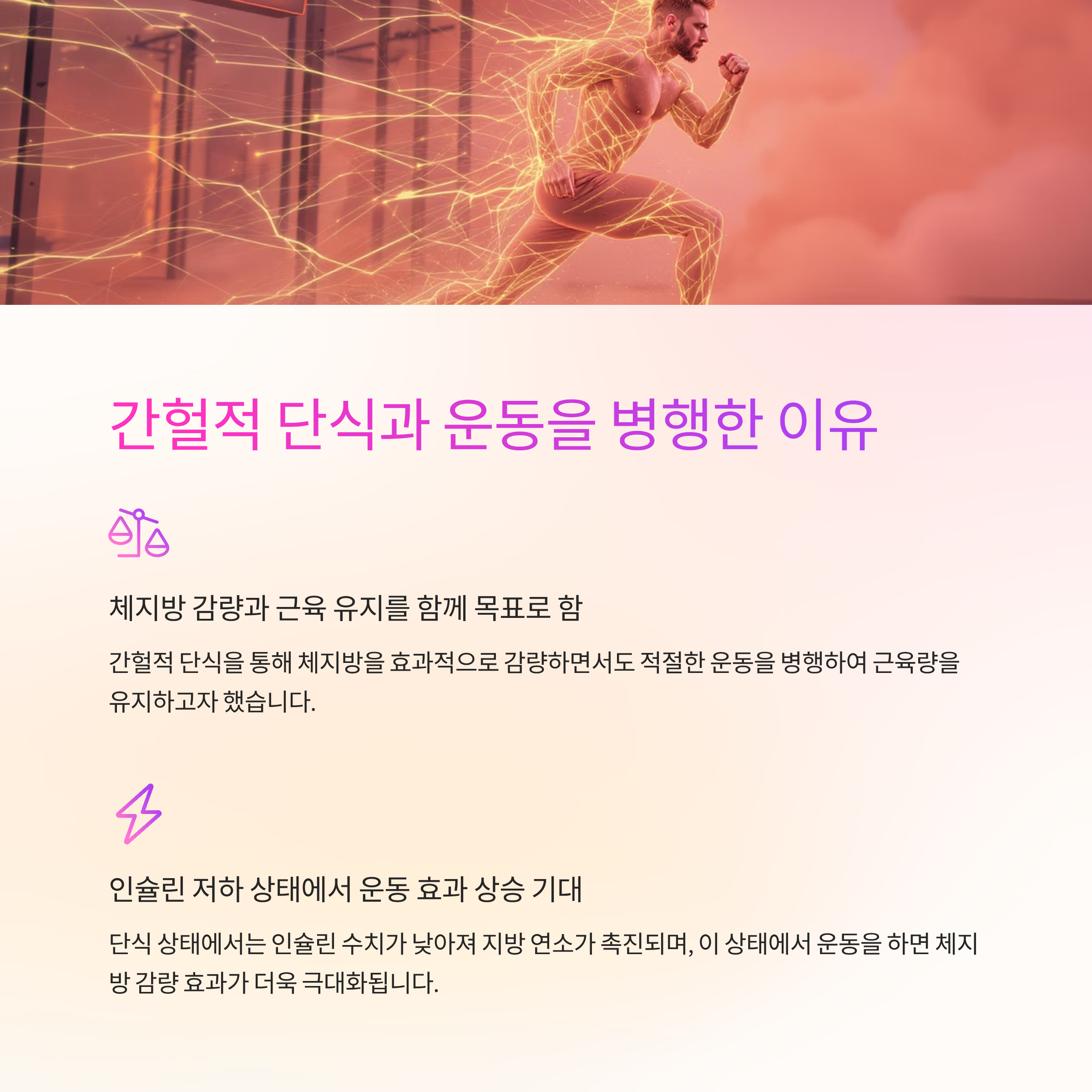 간헐적 단식은 16:8, 18:6, 20:4 등 다양한 방식이 있으며, 저는 가장 보편적인 16:8을 선택했습니다. 즉, 하루 8시간 동안만 식사하고 나머지 16시간은 공복을 유지하는 방식입니다. 여기에 운동을 병행한 이유는 단순히 체중 감량이 아닌 체지방 감량 + 근육 유지라는 목표가 있었기 때문입니다. 단식 중에는 인슐린 수치가 낮아지고 지방 연소가 잘 일어나기 때문에, 이 시기에 유산소 운동이나 근력 운동을 병행하면 더 큰 효과를 기대할 수 있습니다. 물론 쉽지는 않았지만, 꾸준함과 관찰을 통해 체계적인 루틴을 만들어 나갔습니다.