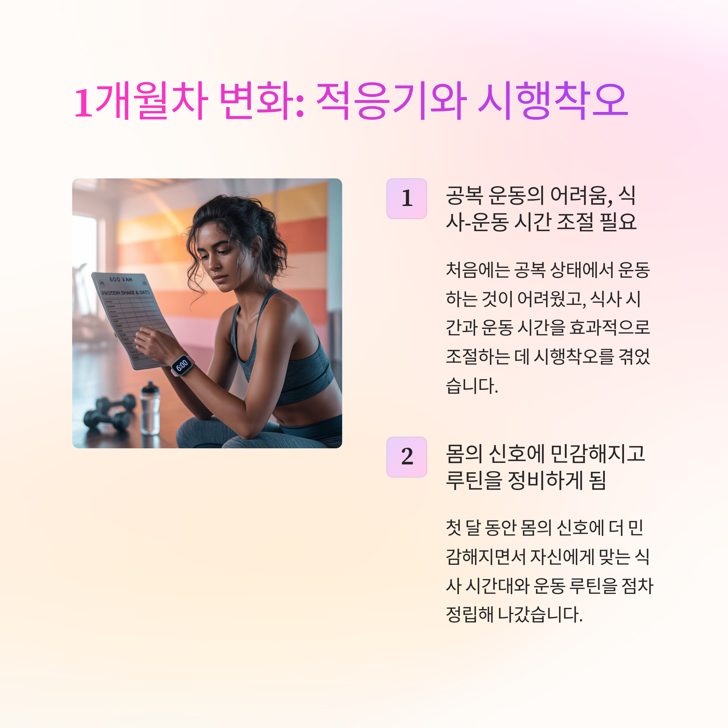 처음 한 달은 말 그대로 적응기였습니다. 공복 상태에서 운동하는 것이 익숙하지 않아 초반에는 어지러움과 에너지 저하를 겪기도 했습니다. 특히 오전 공복 유산소를 시도했을 때는 강도를 낮춰야 했고, 점심 이후 근력운동을 선택하는 방식으로 조절했습니다. 식사 시간에는 단백질 중심의 식단으로 회복에 집중했으며, 수분 섭취와 수면 시간도 함께 관리했습니다. 이 시기에는 체중 변화보다 식습관과 운동 루틴이 정착되는 것이 더 중요했습니다. 무엇보다 몸의 신호를 민감하게 관찰하며 유연하게 반응하는 자세가 필요했습니다.