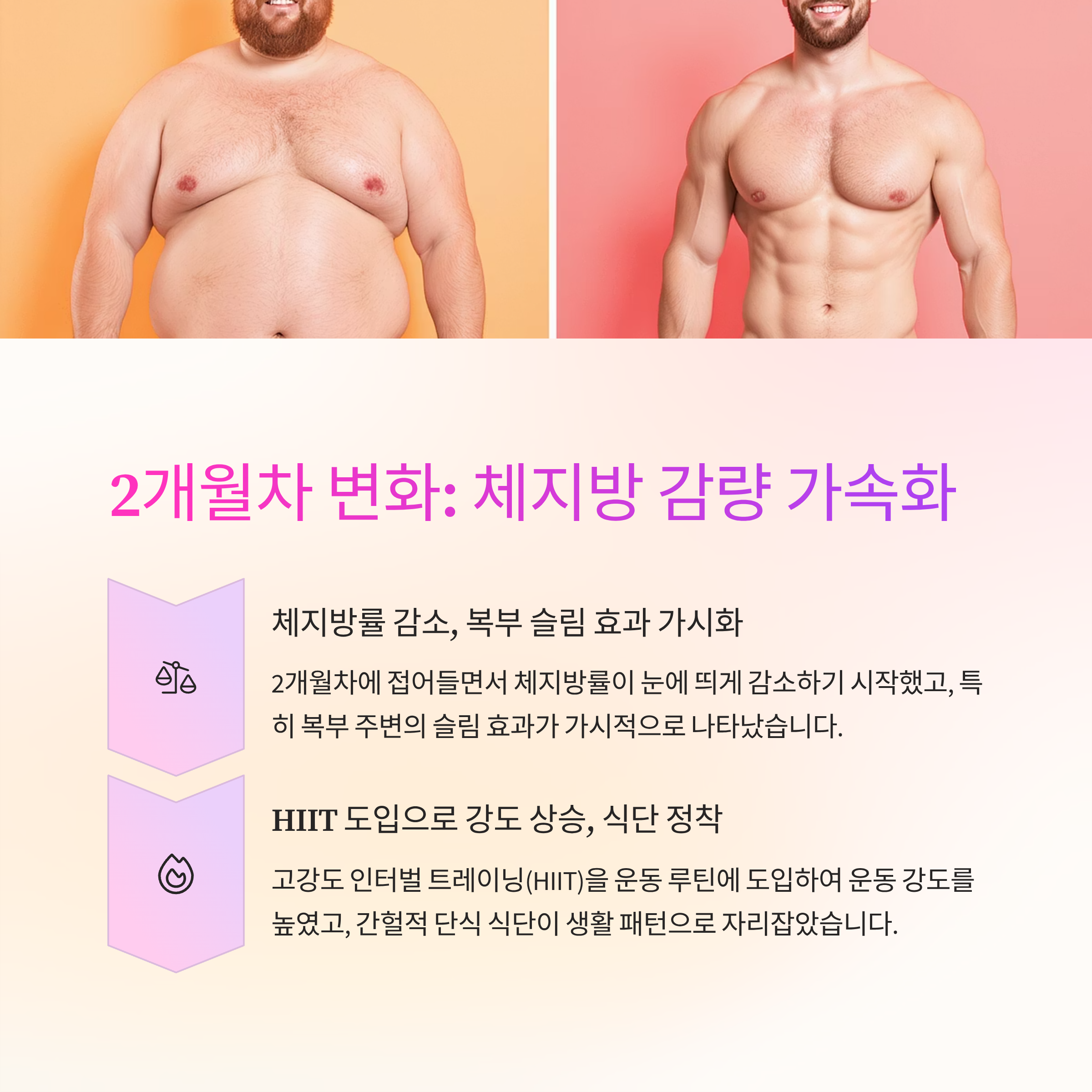 두 번째 달부터는 눈에 띄는 변화가 나타나기 시작했습니다. 체중보다도 체지방률이 빠르게 줄어들었고, 허리 라인과 복부에서 슬림한 변화가 느껴졌습니다. 이 시기에는 식사 조절이 몸에 익고, 공복 운동에도 어느 정도 적응이 된 상태였기에 운동 강도도 조금씩 높일 수 있었습니다. 주 3회 근력운동 + 주 2~3회 유산소를 병행하며, 고강도 인터벌(HIIT)도 도입했습니다. 이때부터는 ‘계획된 단식’과 ‘의식 있는 식사’를 통해 폭식을 피하고, 운동 후 영양 보충도 철저히 신경 썼습니다. 가장 큰 변화는 자신감이 붙었다는 점이었습니다.
