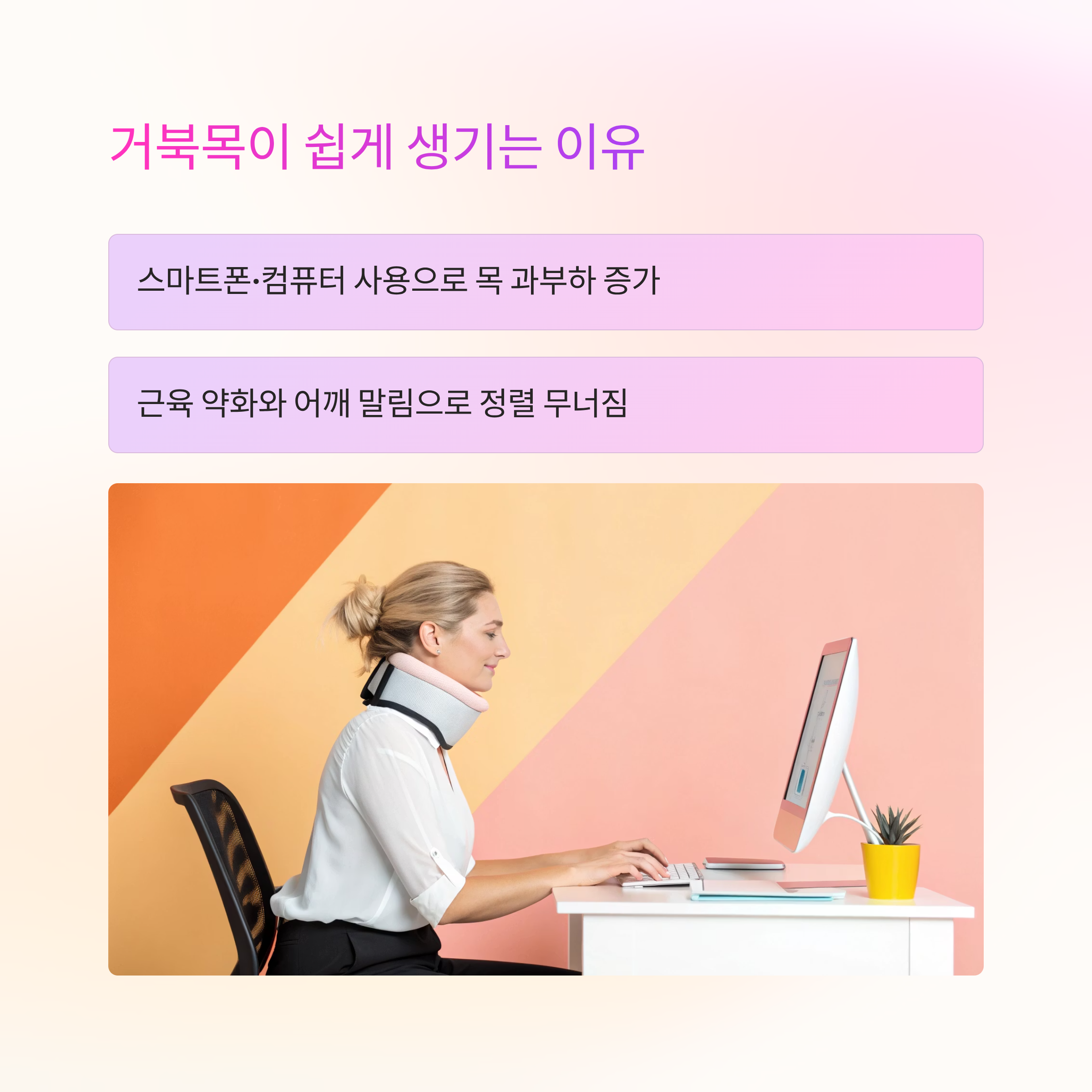 스마트폰, 노트북, 태블릿 등 현대인의 생활 패턴은 자연스럽게 고개를 앞으로 내밀게 만듭니다. 시간이 지날수록 고개가 어깨보다 앞으로 나오는 ‘거북목 자세’가 굳어지고, 이는 결국 어깨 결림·두통·승모근 통증·목 디스크 초기 증상을 유발합니다.