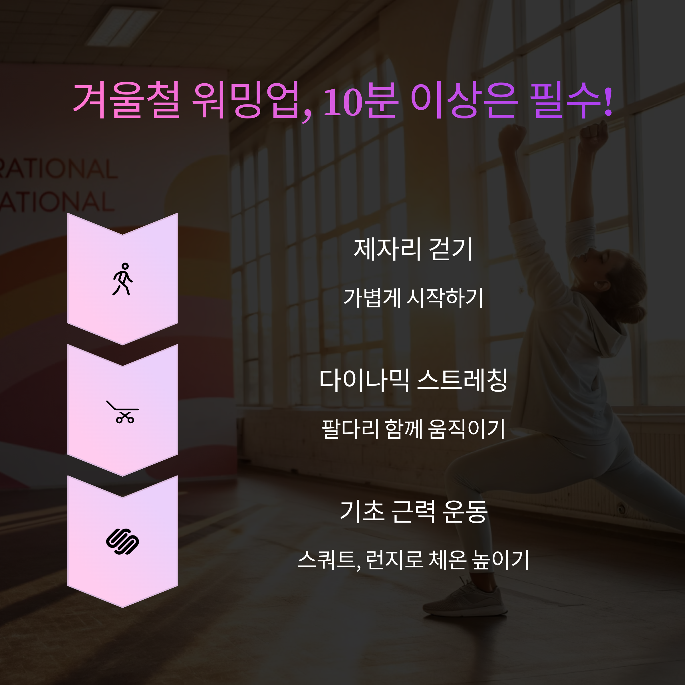 - 스쿼트, 런지 등 체온을 빠르게 높여주는 근력 운동