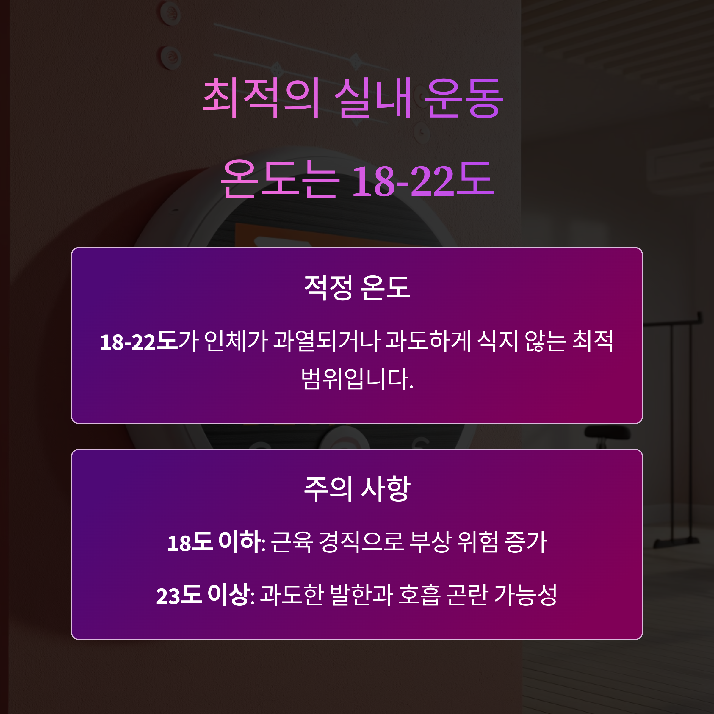 - 특히 조깅머신이나 스피닝처럼 강도가 높은 유산소 운동을 할 경우, 실내 온도는 18~20도 정도가 적절합니다.