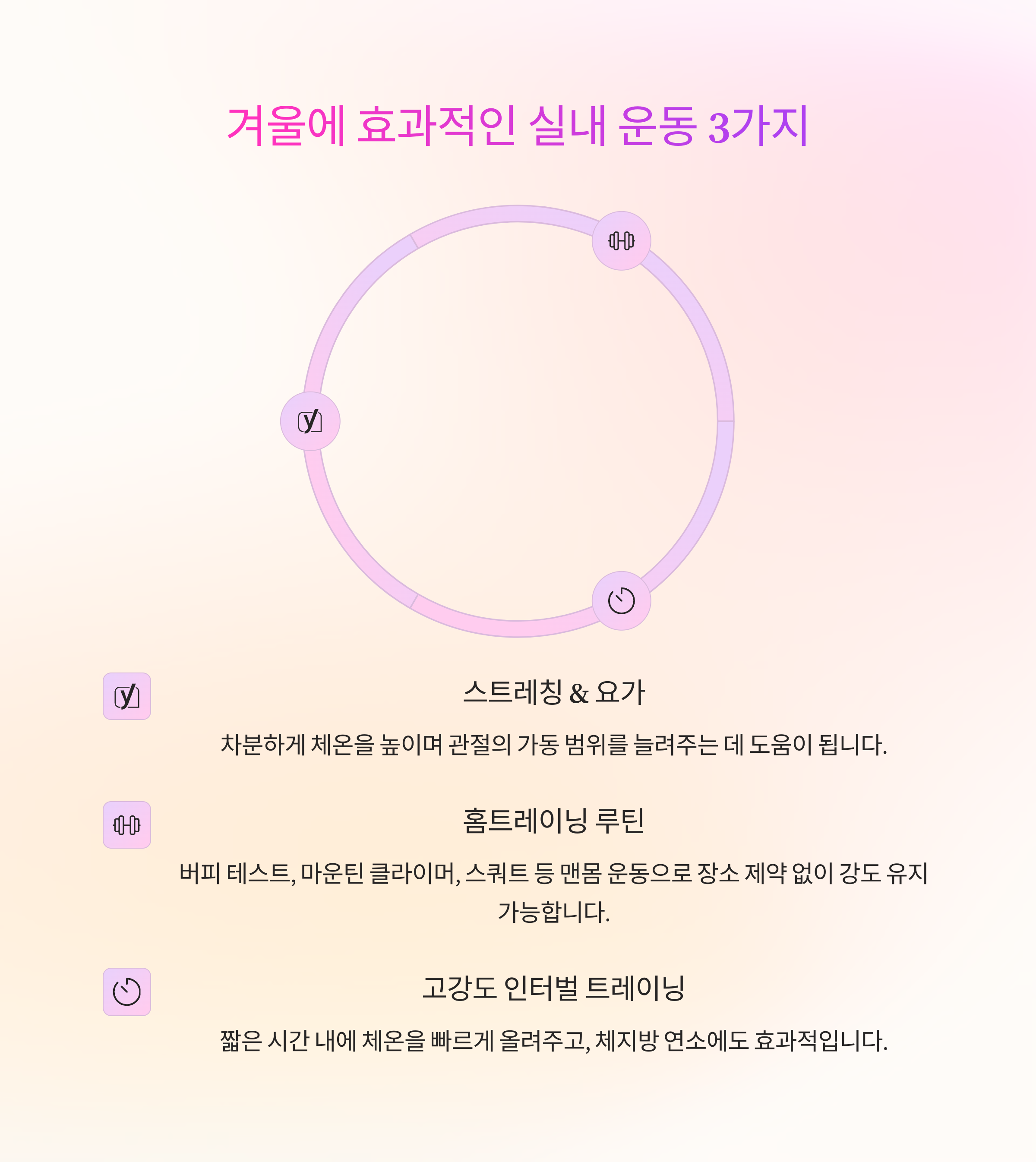 - 스트레칭 & 요가: 실내에서 차분하게 체온을 높이며 관절의 가동 범위를 늘려주는 데 도움이 됩니다.