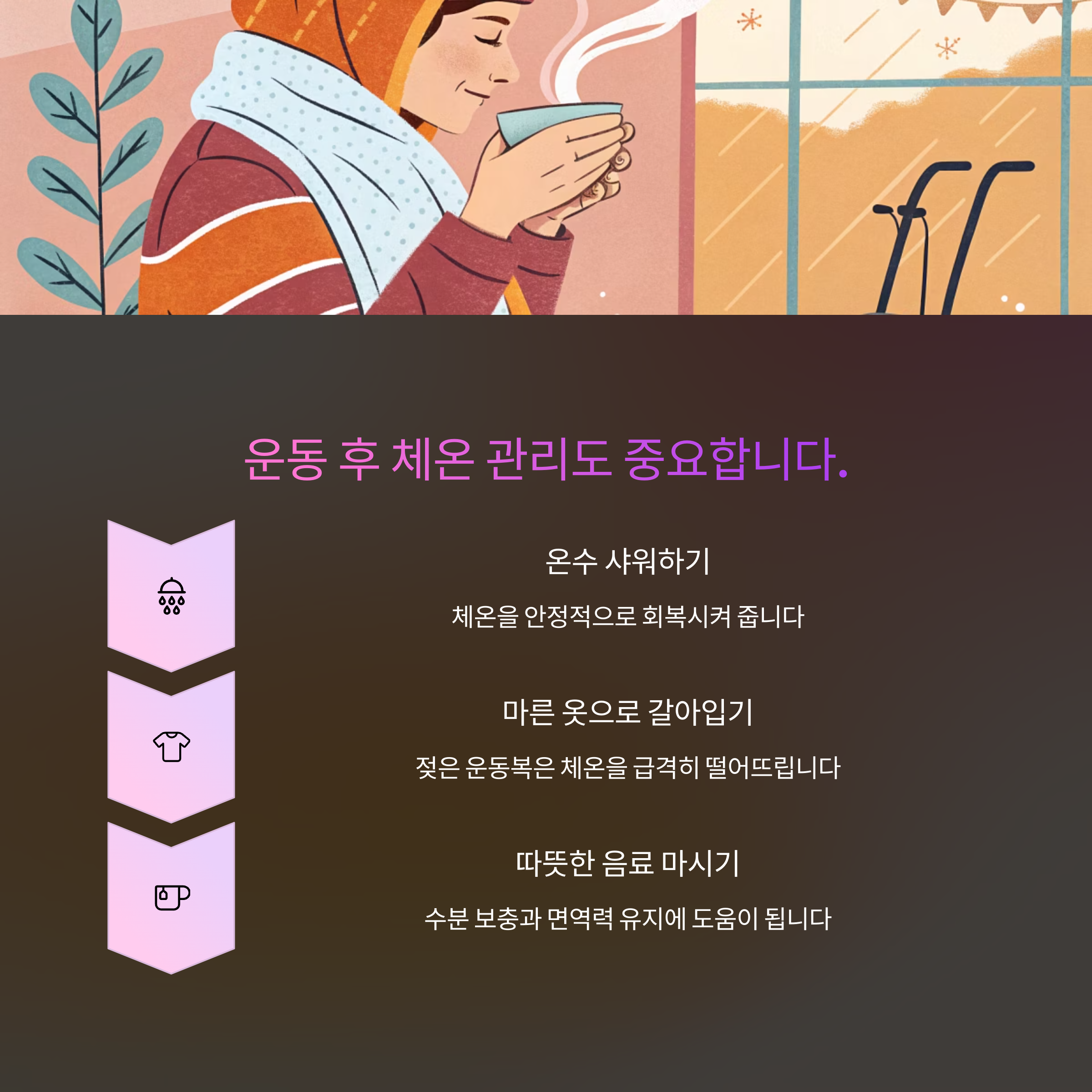 - 운동 후에는 체온이 급격히 떨어지지 않도록 즉시 마른 옷으로 갈아입고, 따뜻한 물을 마셔주는 것이 좋습니다.