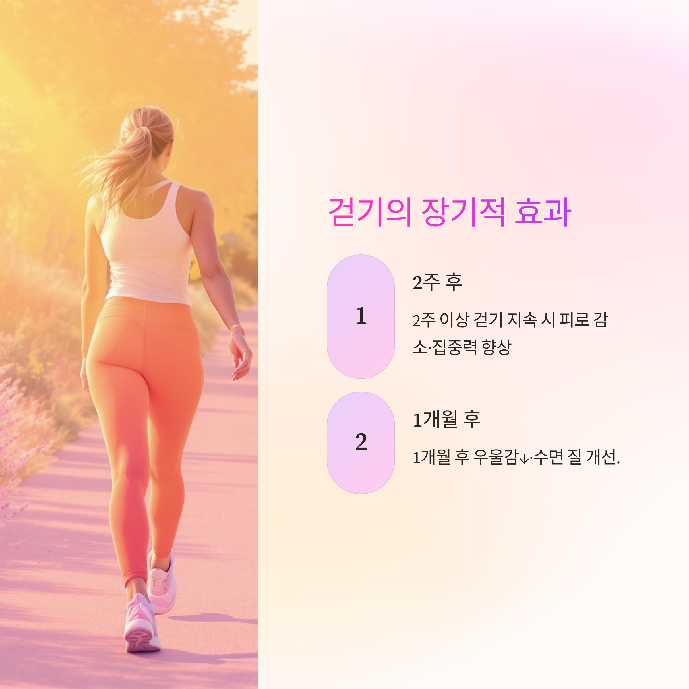 시기 감정 상태 걷기 전 무기력·우울·피곤 2주 후 상쾌함·집중력↑ 1개월 후 우울감↓·수면 질 개선 🔧 7. 함께 실천하면 좋은 생활습관