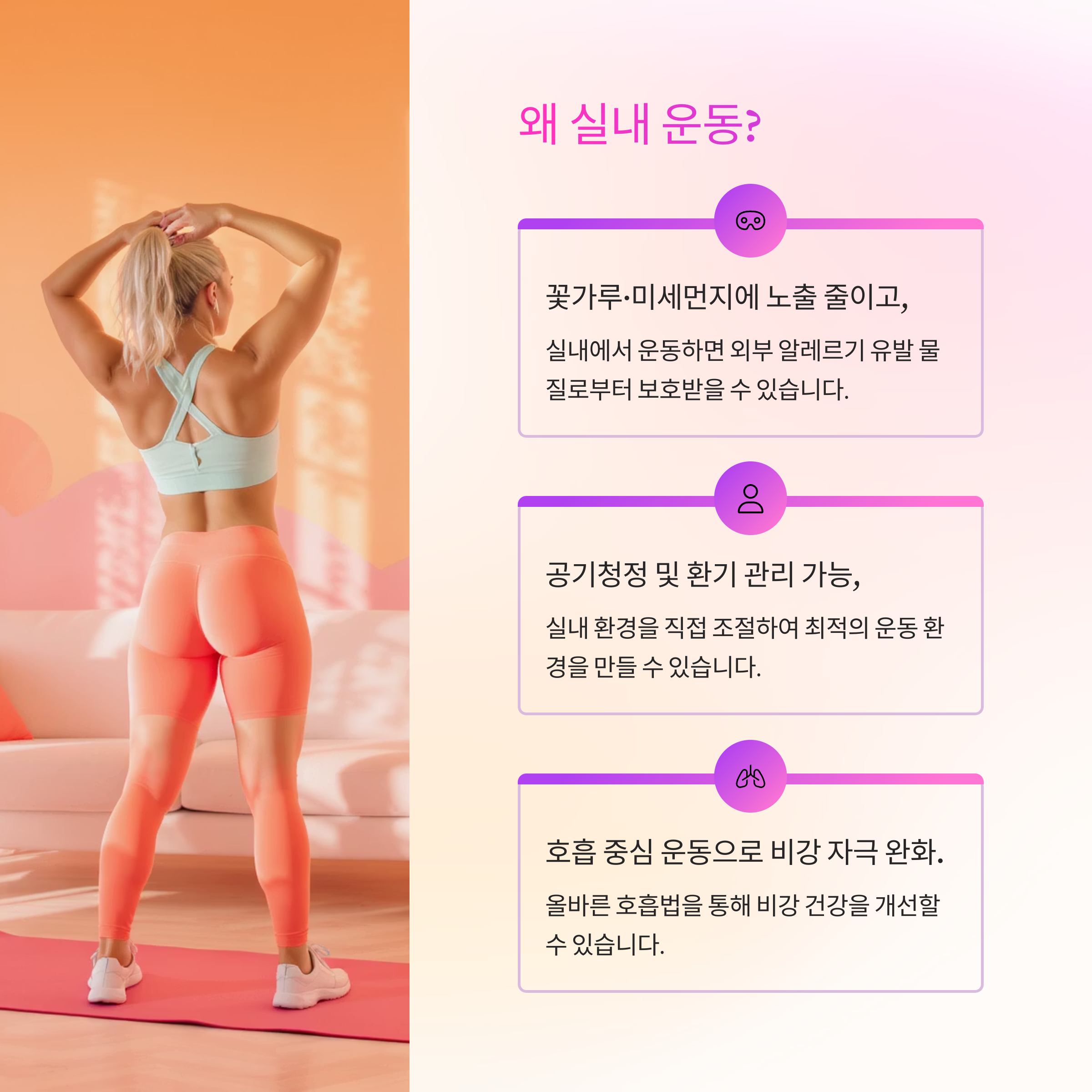 야외의 고농도 꽃가루, 미세먼지, 곰팡이 등은 알레르기를 자극할 수 있어요. 실내는 공기청정기나 환기로 관리 가능하고, 즉각적인 보습이나 코 세척 등 대응이 쉬워 알레르기 예방에 유리하답니다. 특히 스트레칭, 요가, 필라테스 같은 저강도 운동은 호흡 조절에도 좋죠.