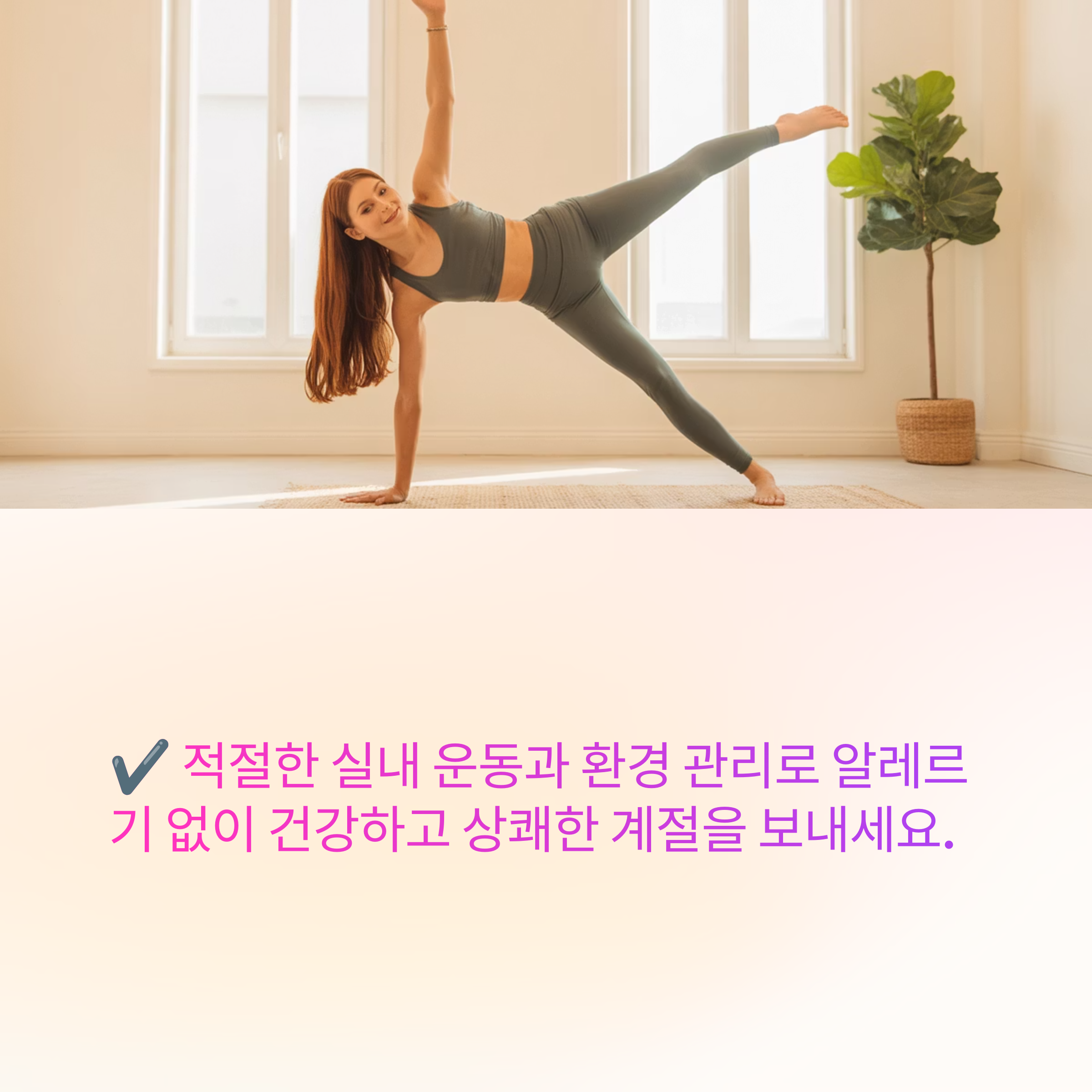 📌 요약하면: 실내에서 적당한 강도의 운동을 하고, 비강 세척과 집 환경 관리를 병행하면 알레르기 부담 없이 체력과 면역력이 함께 향상됩니다. 꾸준히 실천해 보세요!