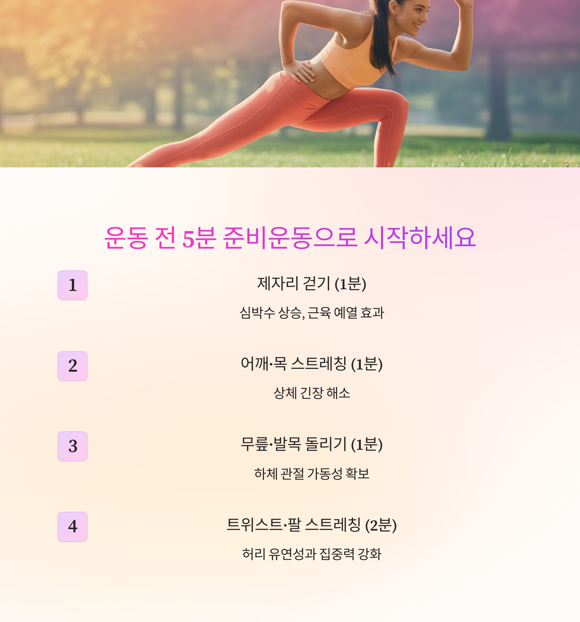 | 제자리 걷기 | 1분 | 심박수 상승, 근육 예열 |