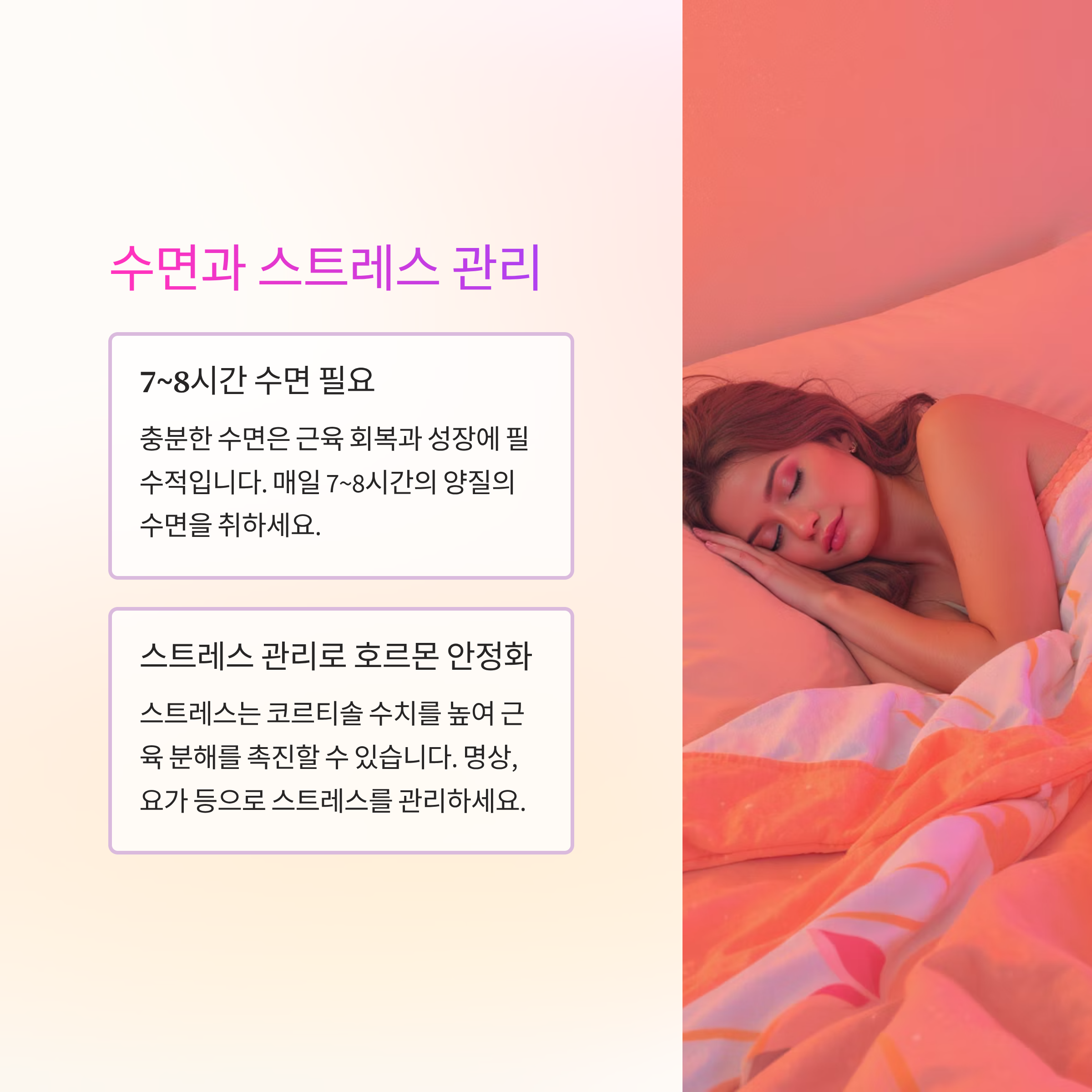 수면 부족과 스트레스는 코르티솔 분비를 증가시켜 근손실과 체지방 축적을 동시에 유발합니다. 따라서 하루 7~8시간의 충분한 수면을 확보하고, 명상, 가벼운 스트레칭, 호흡 운동 등을 통해 스트레스를 관리하는 것이 필요합니다. 수면 패턴이 규칙적일수록 호르몬 밸런스가 안정되고 다이어트 효과도 향상됩니다.