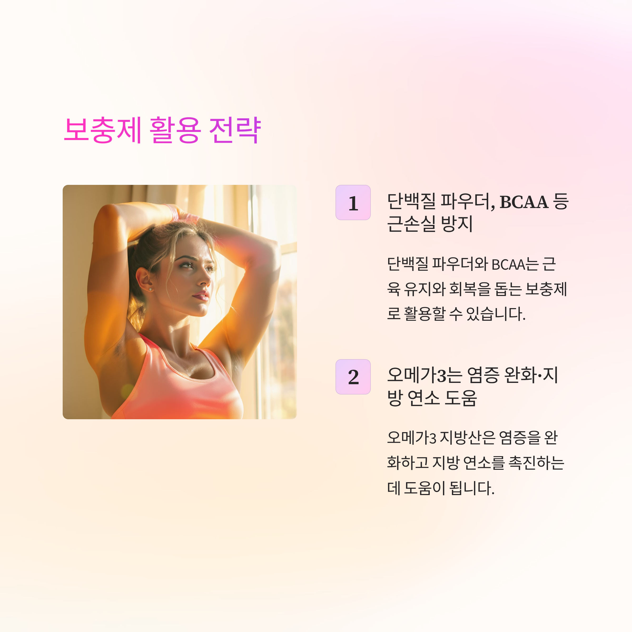 보충제는 다이어트의 필수 조건은 아니지만, 부족한 영양을 채우는 데 도움을 줄 수 있습니다. 단백질 파우더는 간편하게 단백질을 보충할 수 있으며, BCAA나 EAA 같은 아미노산 보충제는 근손실 방지에 유용합니다. 또한 오메가3는 염증 완화와 지방 연소 촉진에 도움을 줄 수 있습니다. 하지만 어디까지나 보조적인 수단일 뿐, 균형 잡힌 식단이 가장 중요합니다.