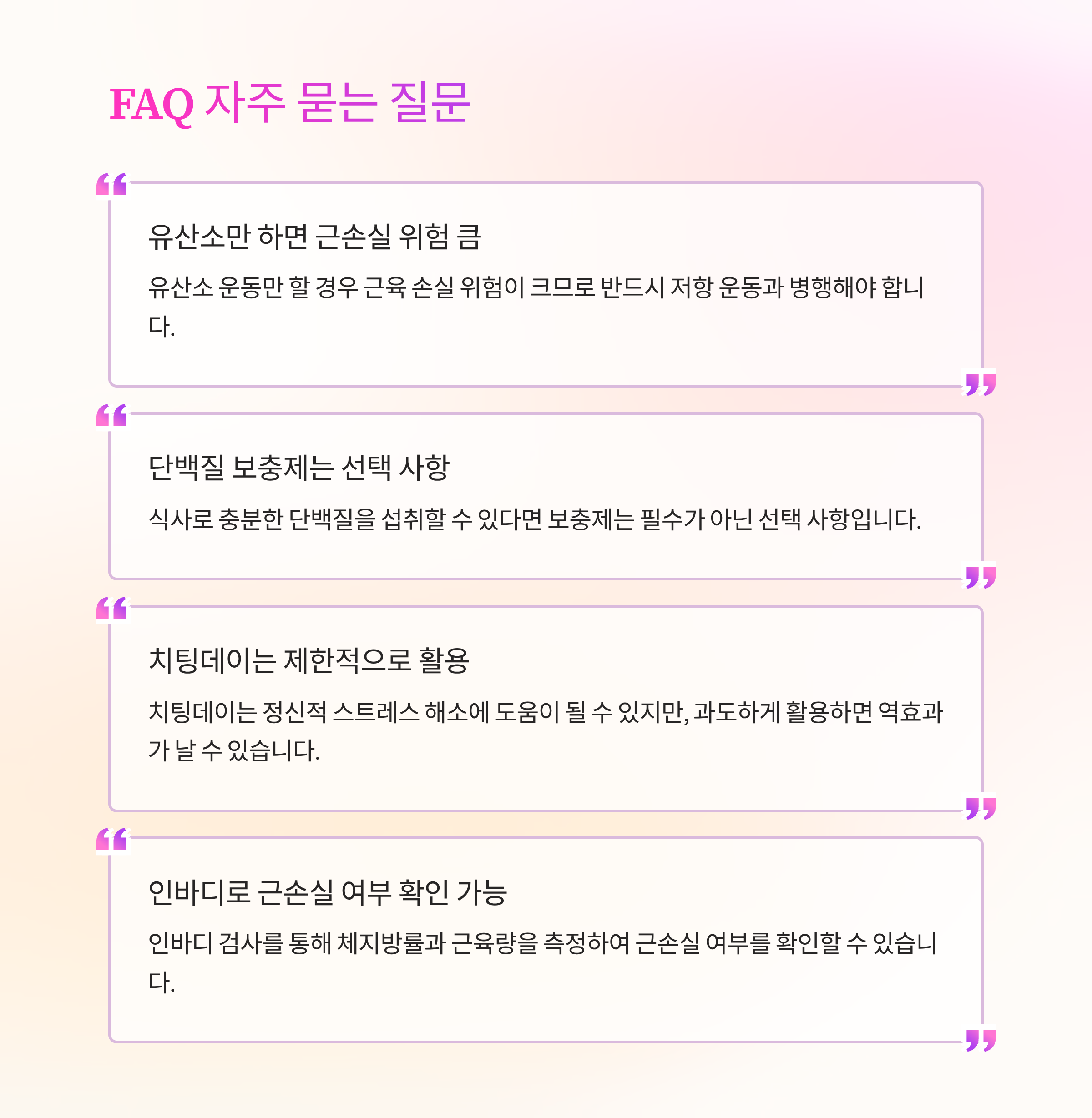 근육은 단순히 외형을 위한 것이 아니라, 기초대사량 유지와 체력의 핵심입니다. 근손실이 발생하면 같은 양의 칼로리를 섭취해도 체중이 다시 쉽게 늘어나고, 요요 현상이 발생할 확률이 높아집니다. 또한 면역력 저하, 관절 부담 증가, 운동 수행 능력 저하 등 부정적인 영향이 큽니다. 따라서 다이어트는 무조건 체중 감량보다 체지방 감량과 근육 보존에 집중해야 합니다.