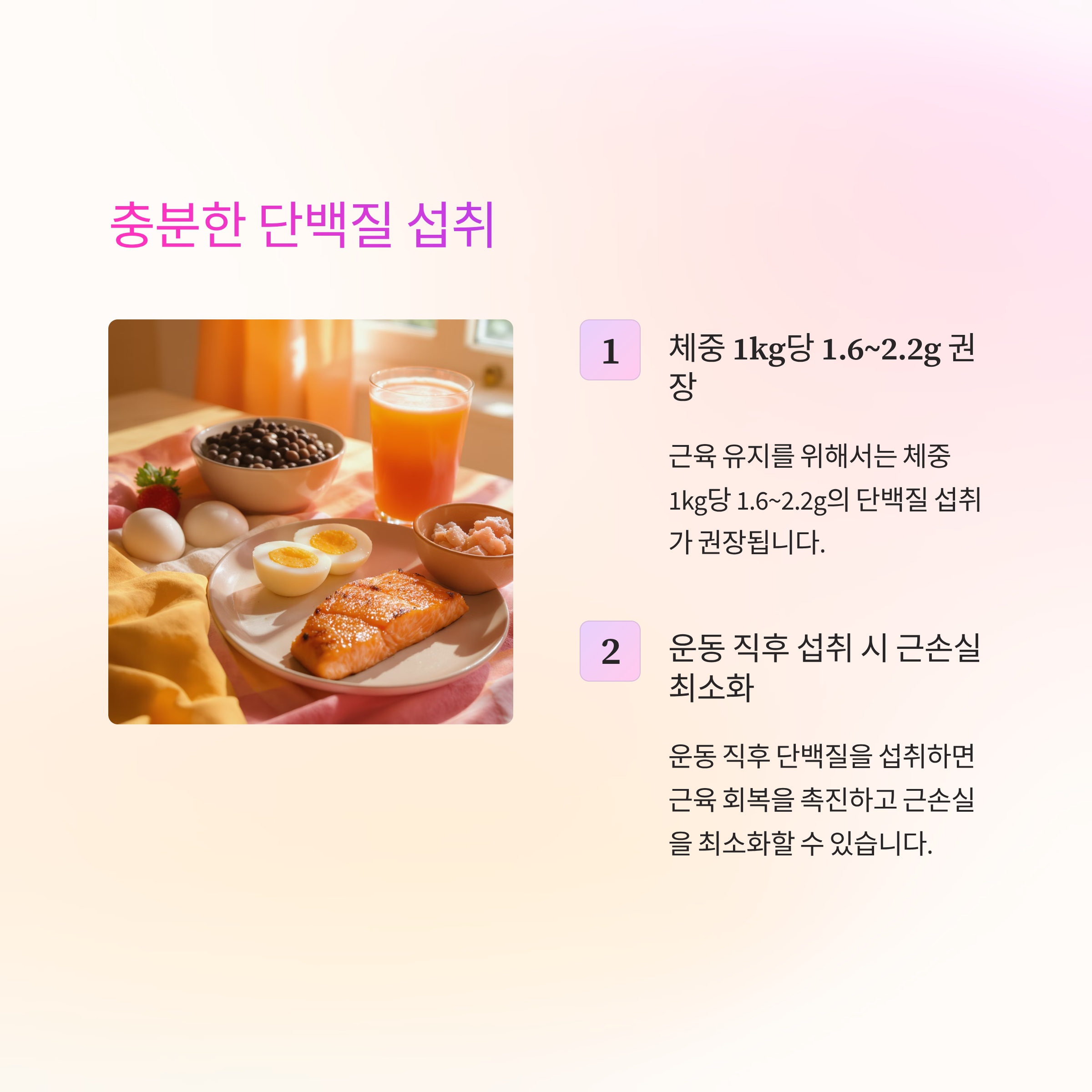 단백질은 근육을 유지하는 데 가장 중요한 영양소입니다. 체중 1kg당 최소 1.6~2.2g의 단백질 섭취가 권장되며, 닭가슴살, 두부, 계란, 생선, 콩류 등으로 꾸준히 보충해야 합니다. 또한 한 번에 많은 양을 먹기보다는 하루 3~5회로 나누어 섭취하는 것이 좋습니다. 운동 직후 단백질을 섭취하면 근단백 합성을 촉진해 근손실을 최소화할 수 있습니다.