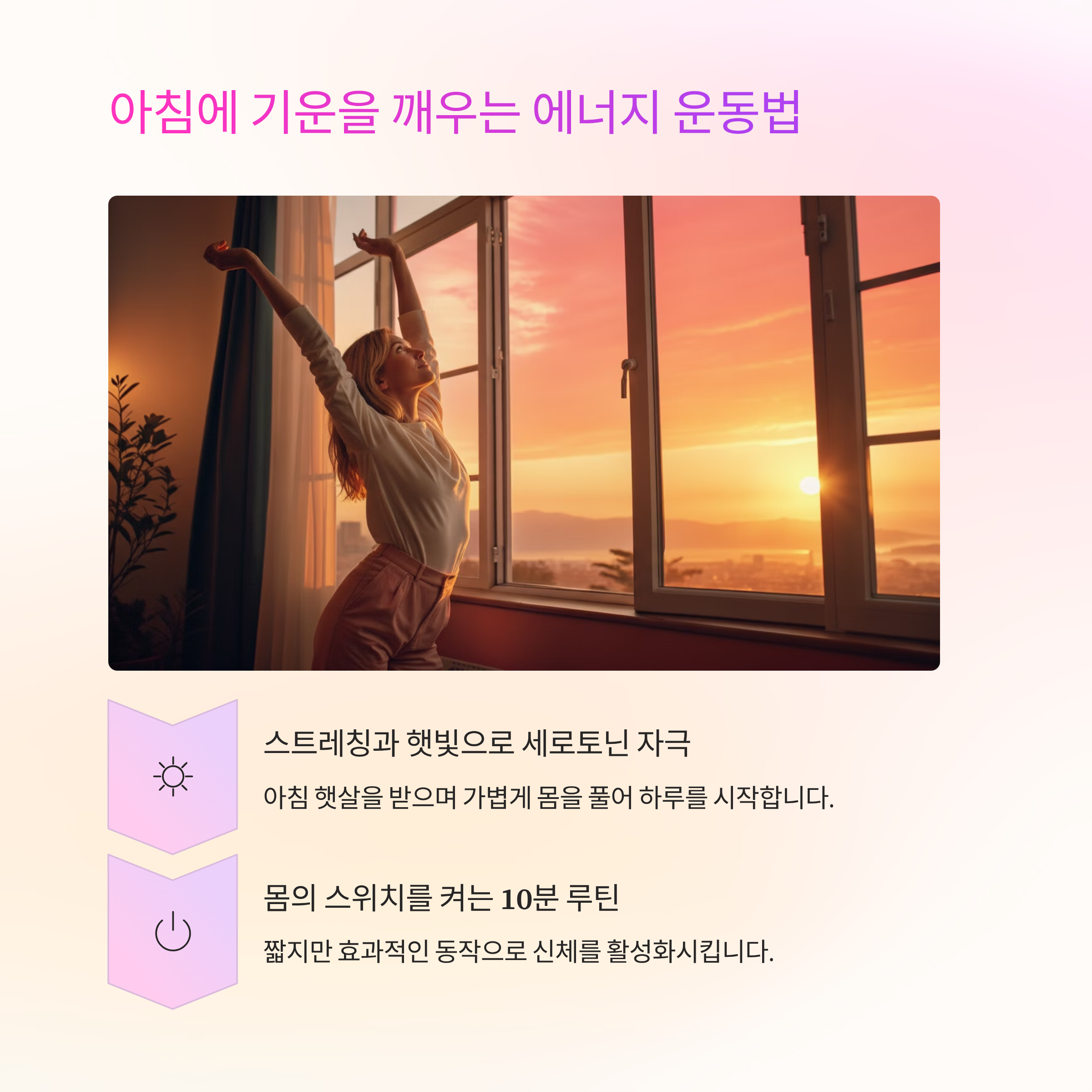 기상 후 10분 스트레칭만으로도 하루의 에너지가 달라집니다.
