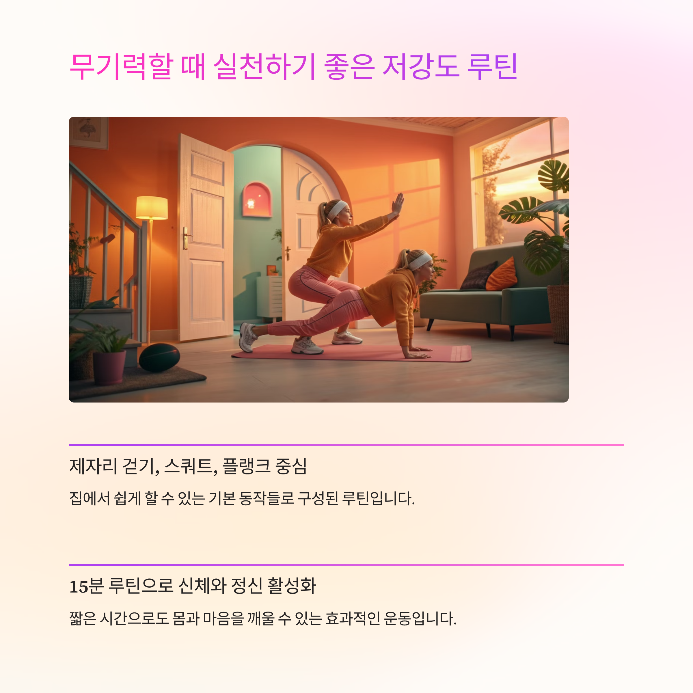 이 루틴은 신체를 가볍게 자극하면서 피로보다 활력을 느끼게 합니다.