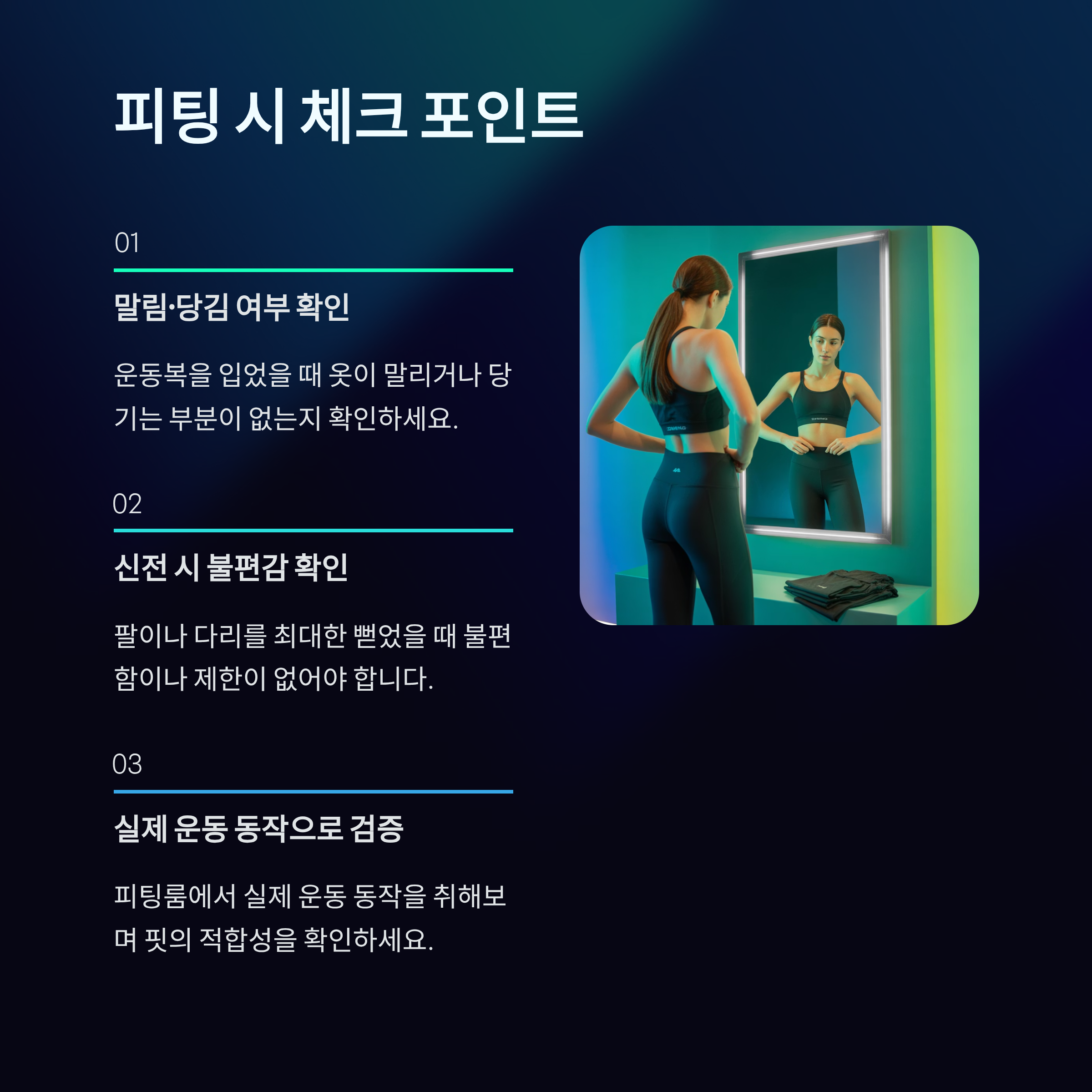 피팅 시에는 실제 운동 동작(스쿼트, 런지, 스트레칭 등)을 해보는 것이 가장 정확합니다.