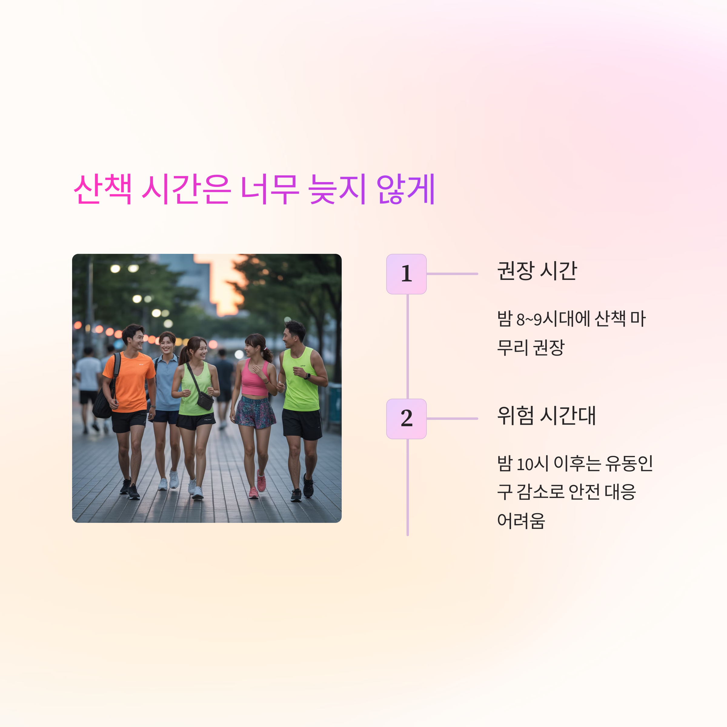 가급적 밤 8~9시대 산책을 마무리하고, 가능하면 동반자와 함께 걷는 것이 안전합니다.