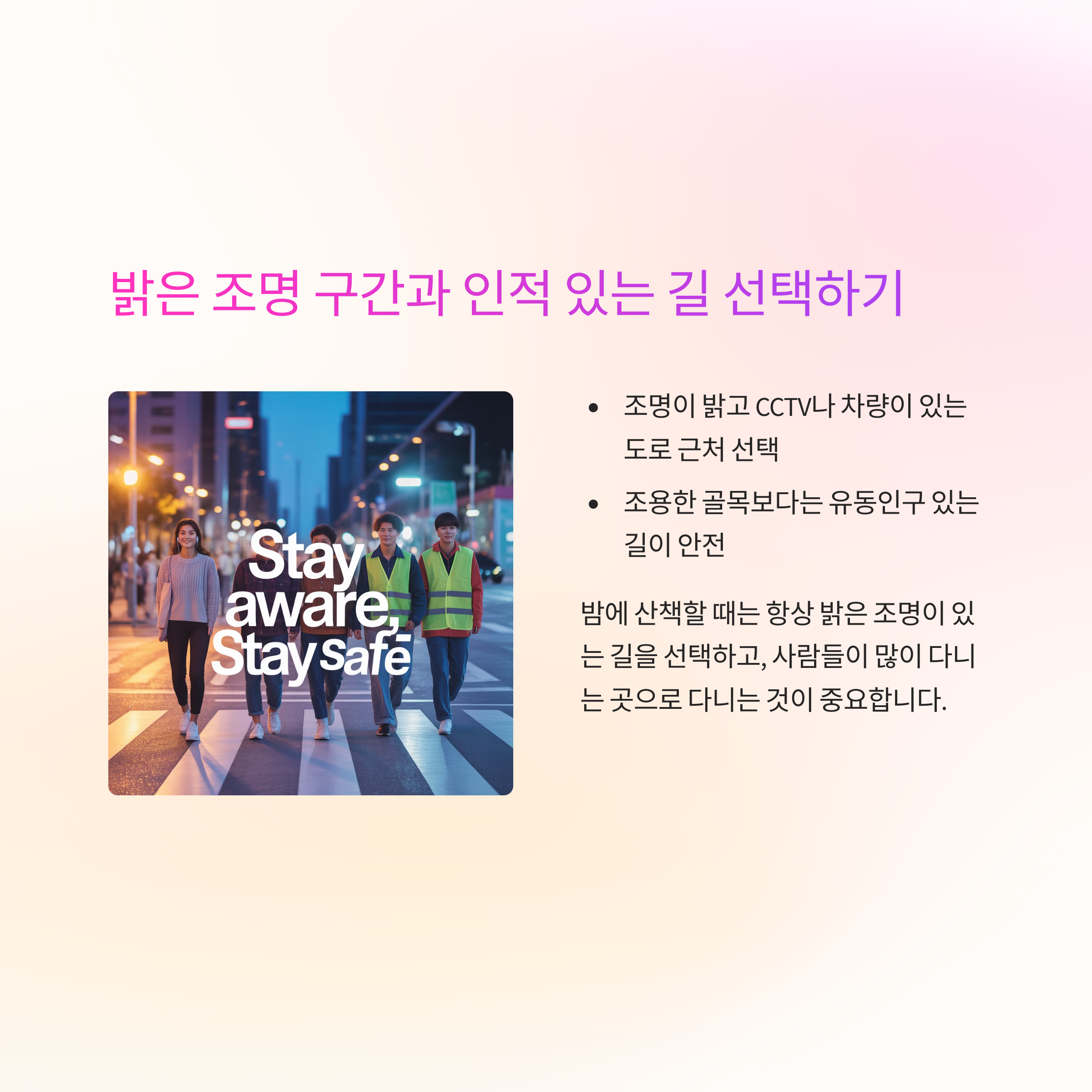 💡 밝은 조명 구간과 인적 있는 길 선택하기
