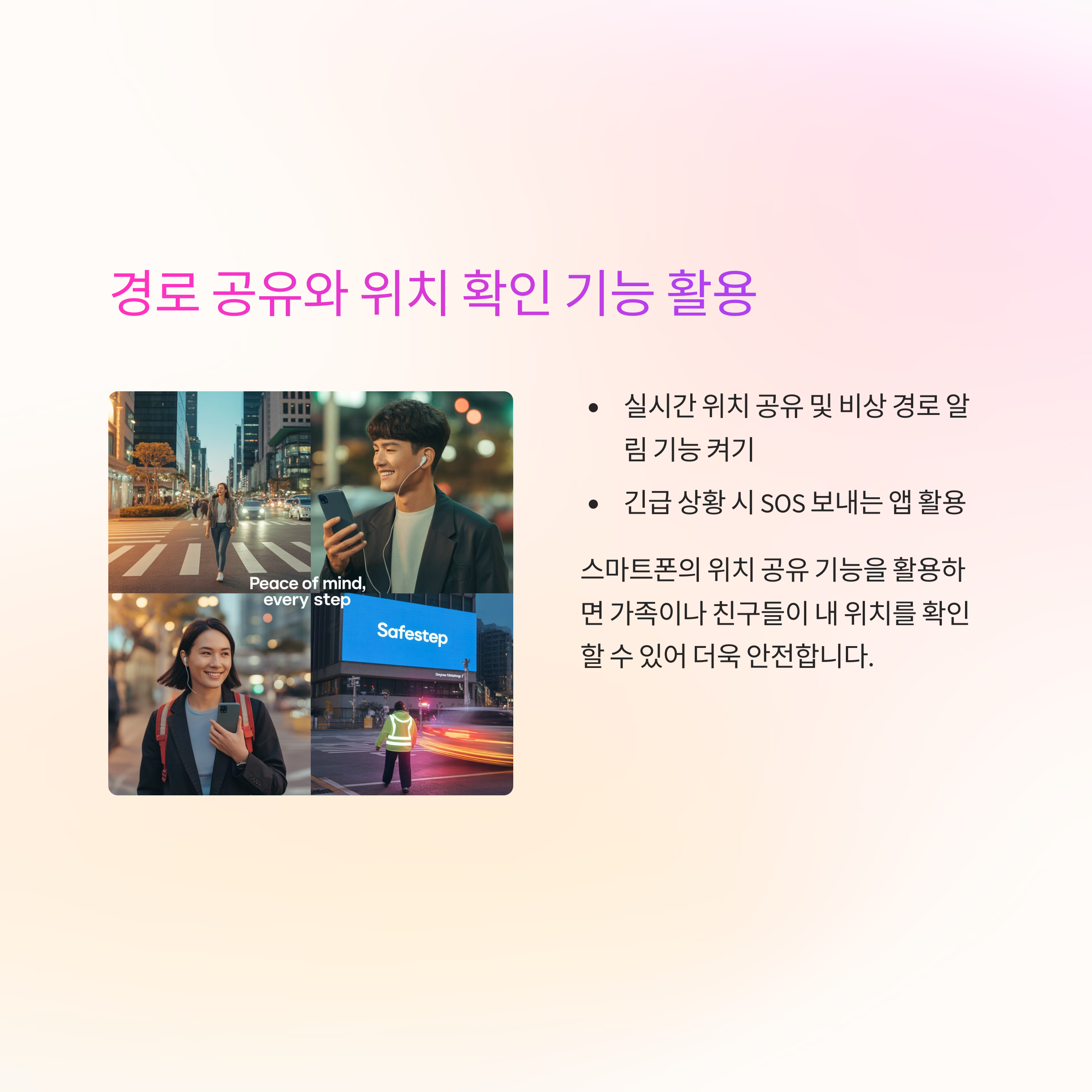 가족이나 친구에게 산책 경로를 실시간으로 공유하거나 위치 확인 앱을 활성화해 보세요.