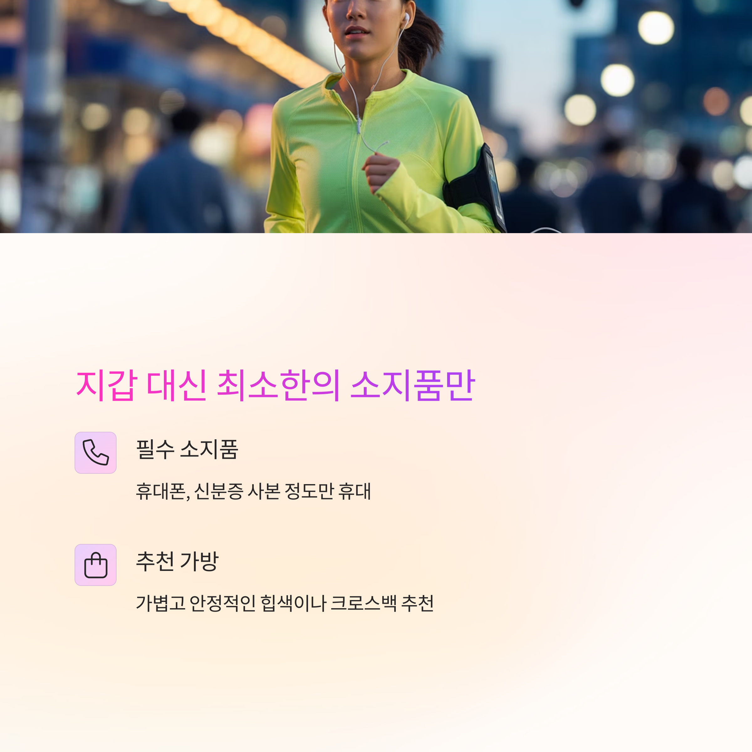 밤 산책 시 귀중품(현금, 카드 등)은 피하고, 휴대폰과 신분증 사본 정도로 최소화하세요.