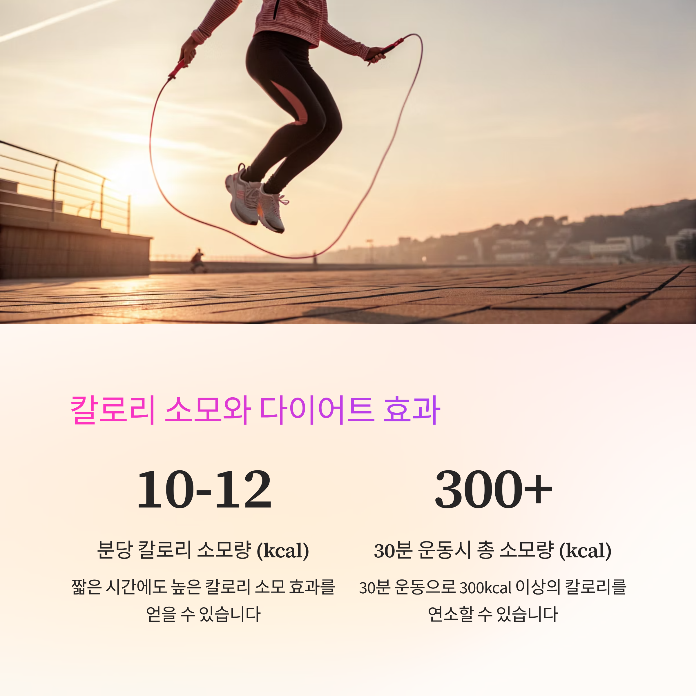 줄넘기는 짧은 시간 안에 심박수를 끌어올려 체지방을 태우고, 전신 근육을 고르게 사용하는 운동입니다. - 심폐 지구력 강화