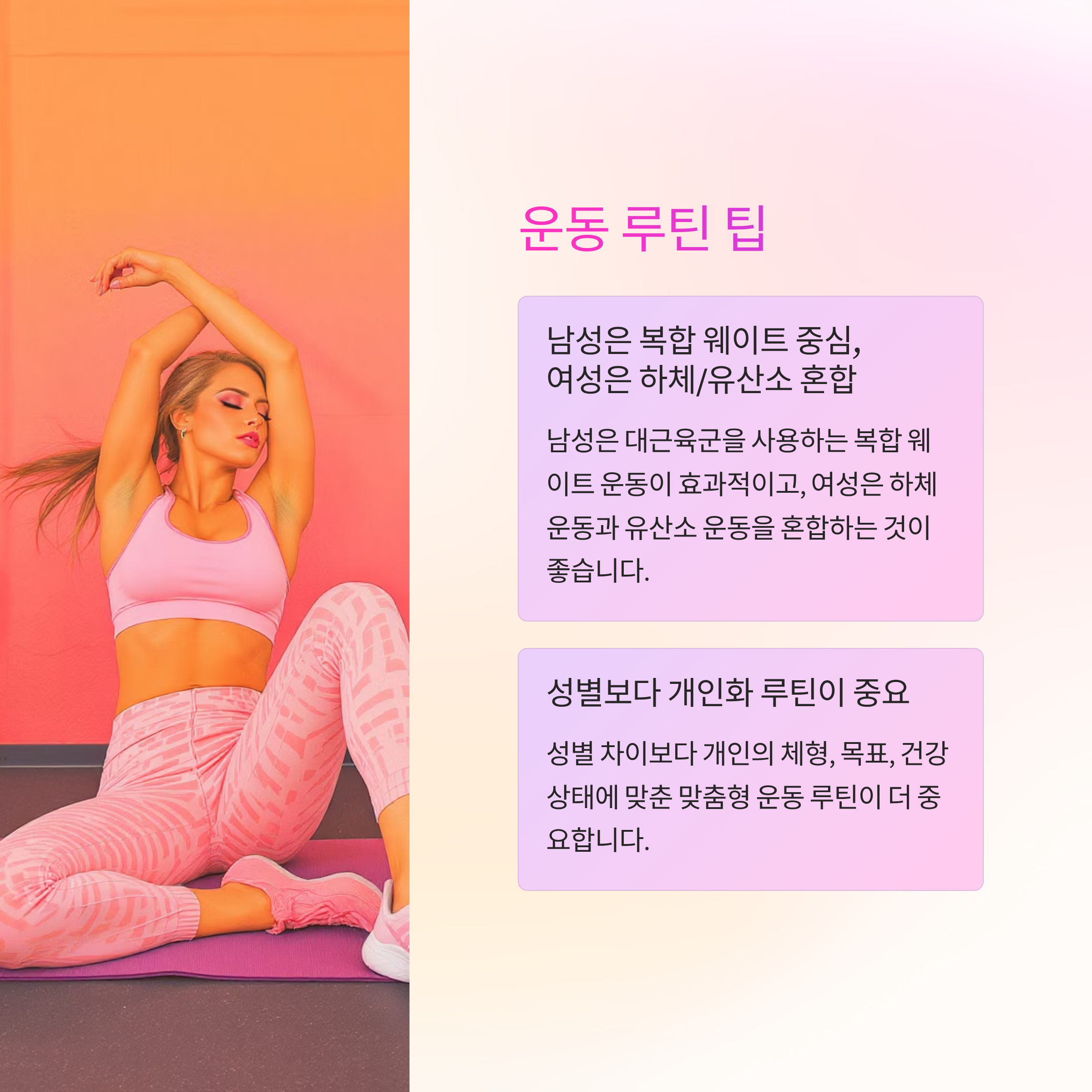 - 남성: 근육량 증가 중심 → 상체 웨이트, 복합 다관절 운동 위주 루틴