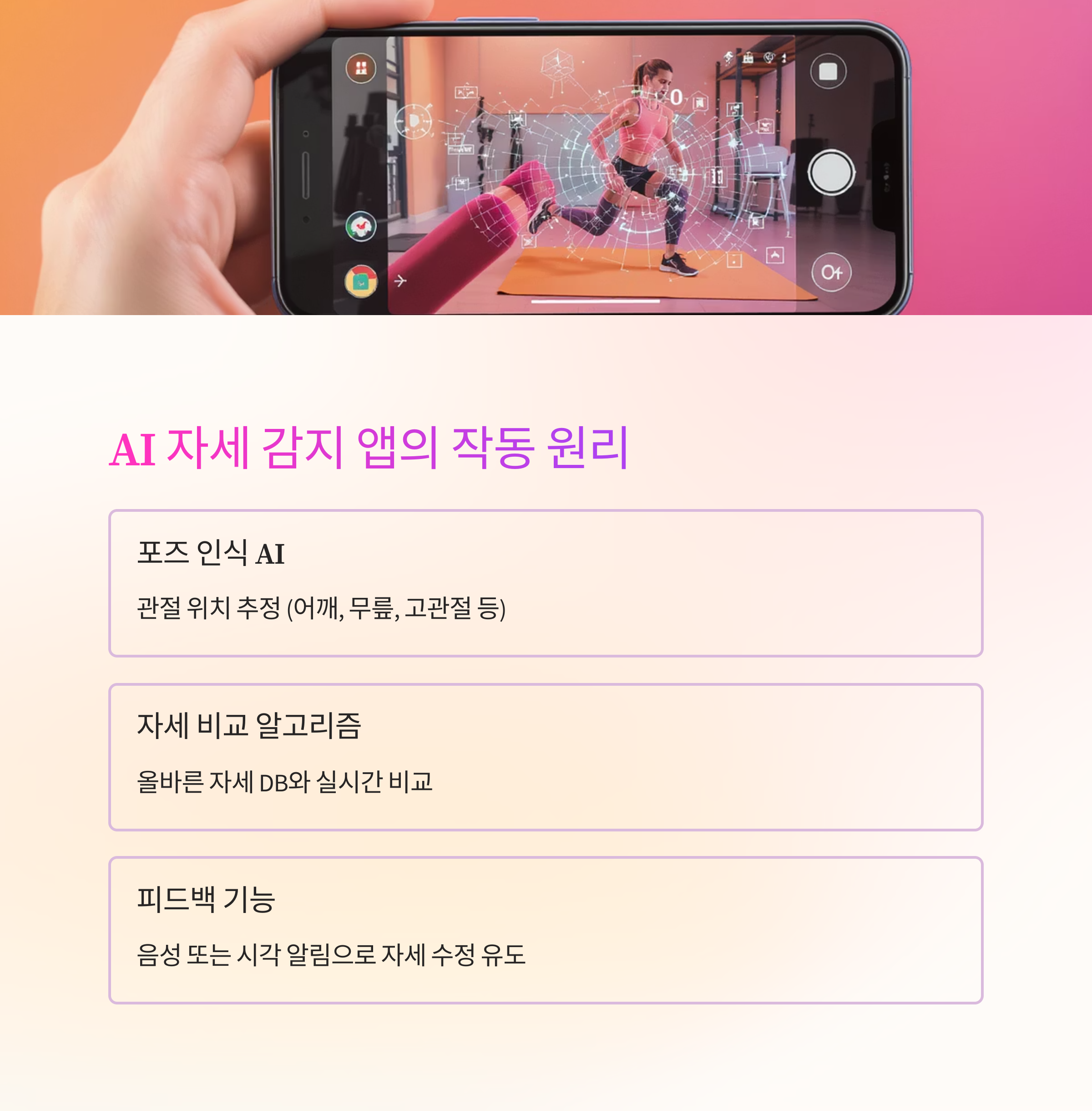 AI 자세 감지 앱은 스마트폰 카메라를 통해 사용자의 관절 움직임을 추적합니다. 딥러닝 기반의 포즈 인식 기술(Pose Estimation)을 활용해 신체 부위를 인식하고, 정해진 운동 자세와 비교해 정확도를 분석합니다.