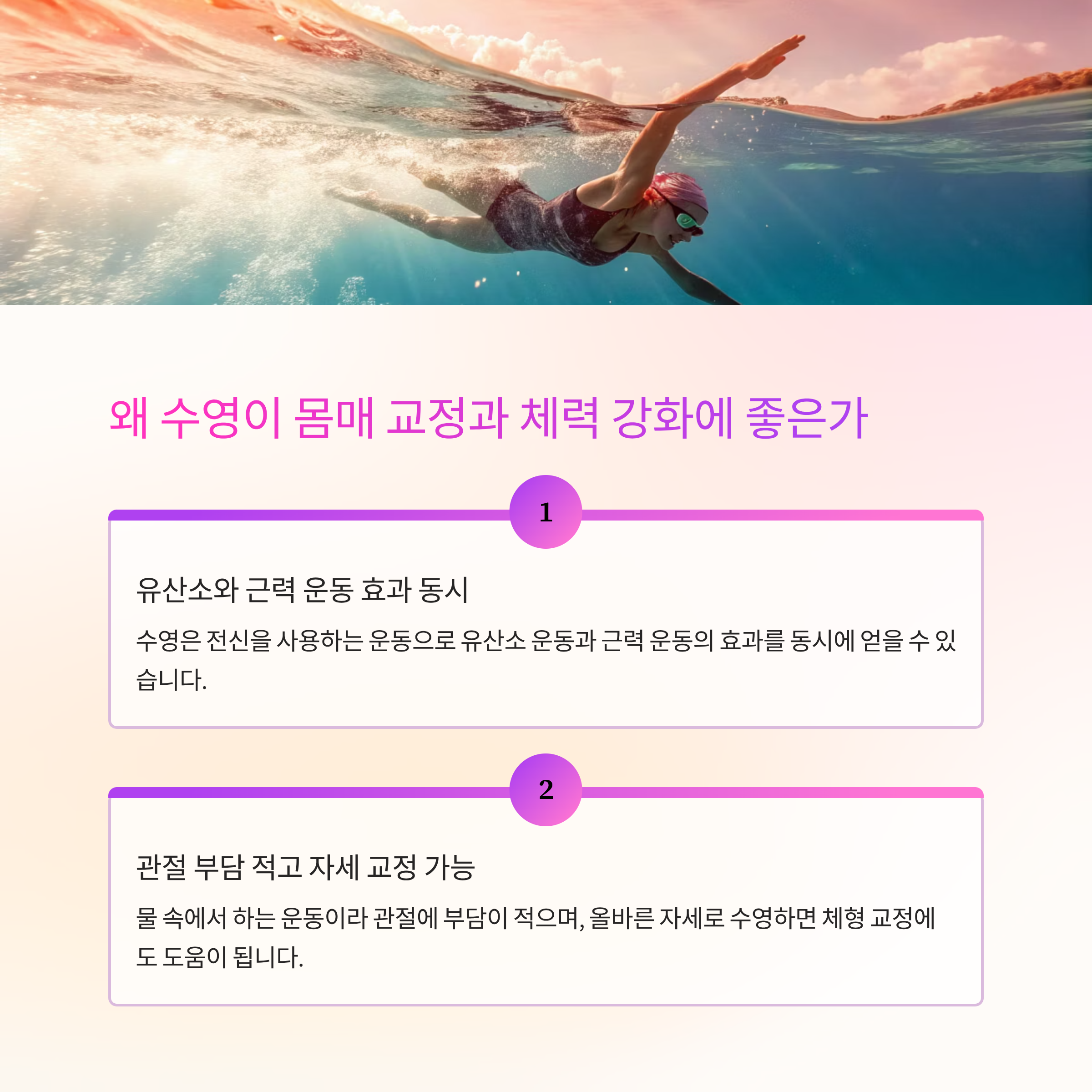 수영은 유산소와 근력 운동이 동시에 가능한 대표적인 복합 운동입니다. 평영, 자유형, 배영, 접영 등 각 영법마다 자극하는 근육군이 달라 체형 교정에 맞춤형 접근이 가능합니다. 또한 수압과 부력 덕분에 관절에 무리가 적어 남녀노소 누구에게나 안전합니다. 특히 바른 자세와 호흡법을 익히면 자세 교정과 폐활량 증진에도 탁월합니다.