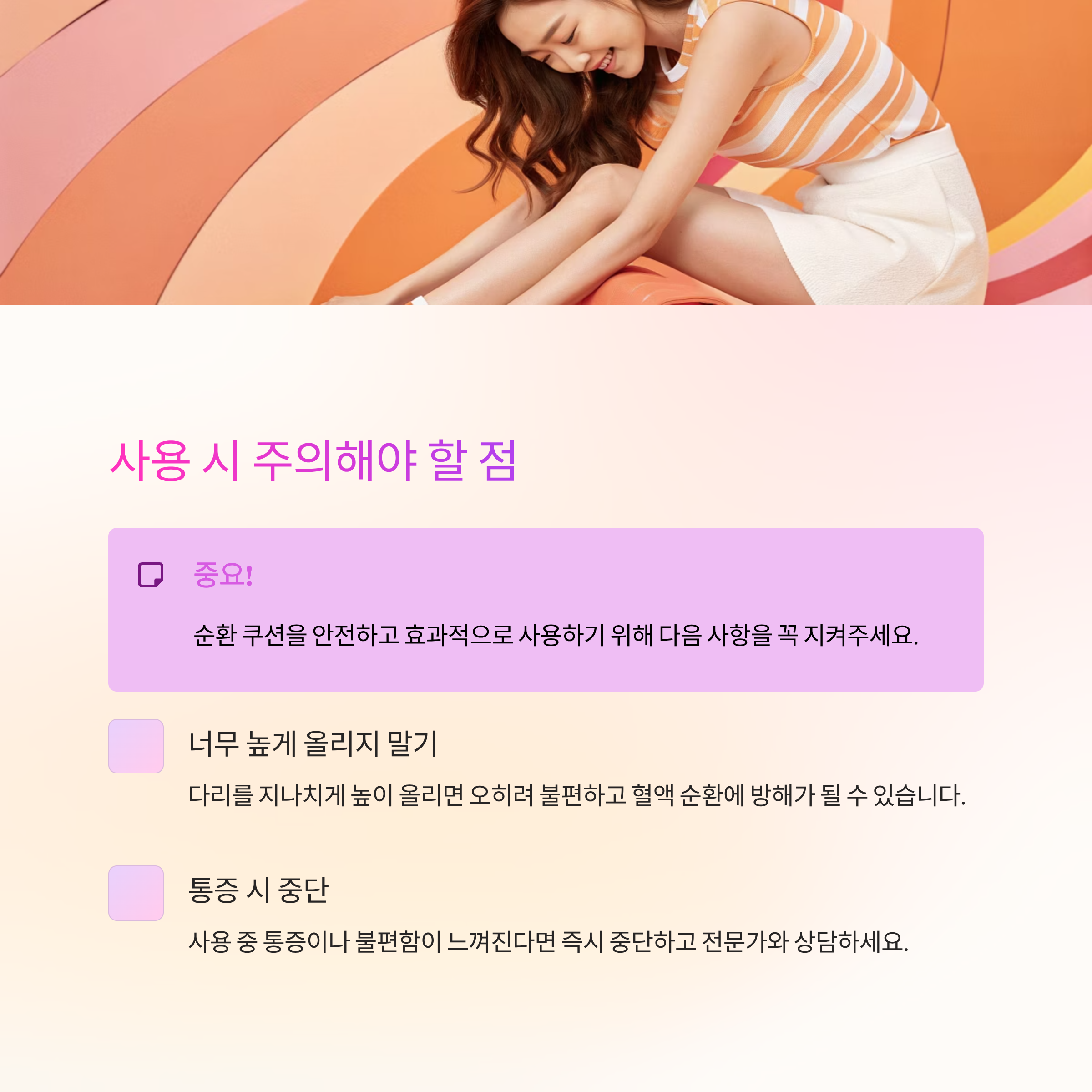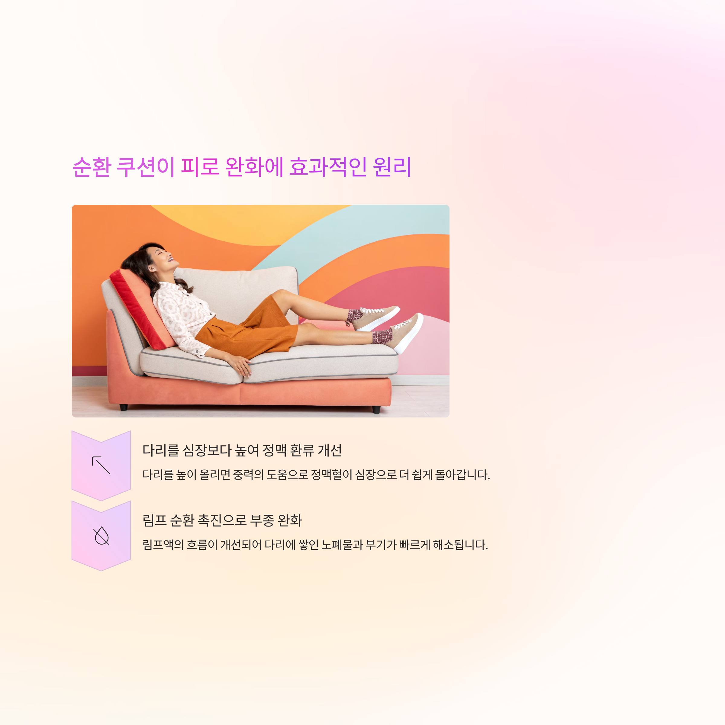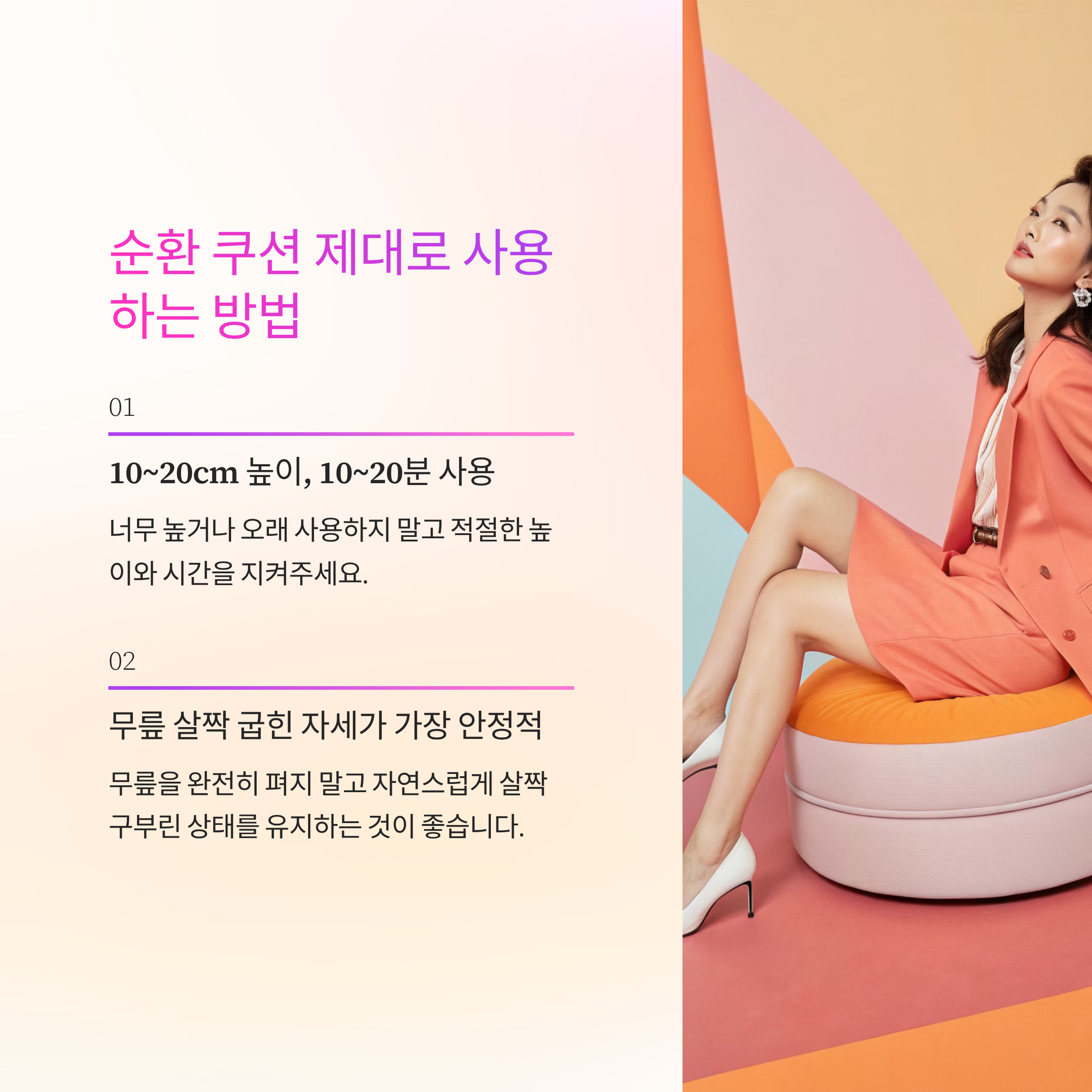 이럴 때 순환 쿠션을 활용하면 단 5~10분 만에도 눈에 띄는 가벼움을 느낄 수 있습니다.