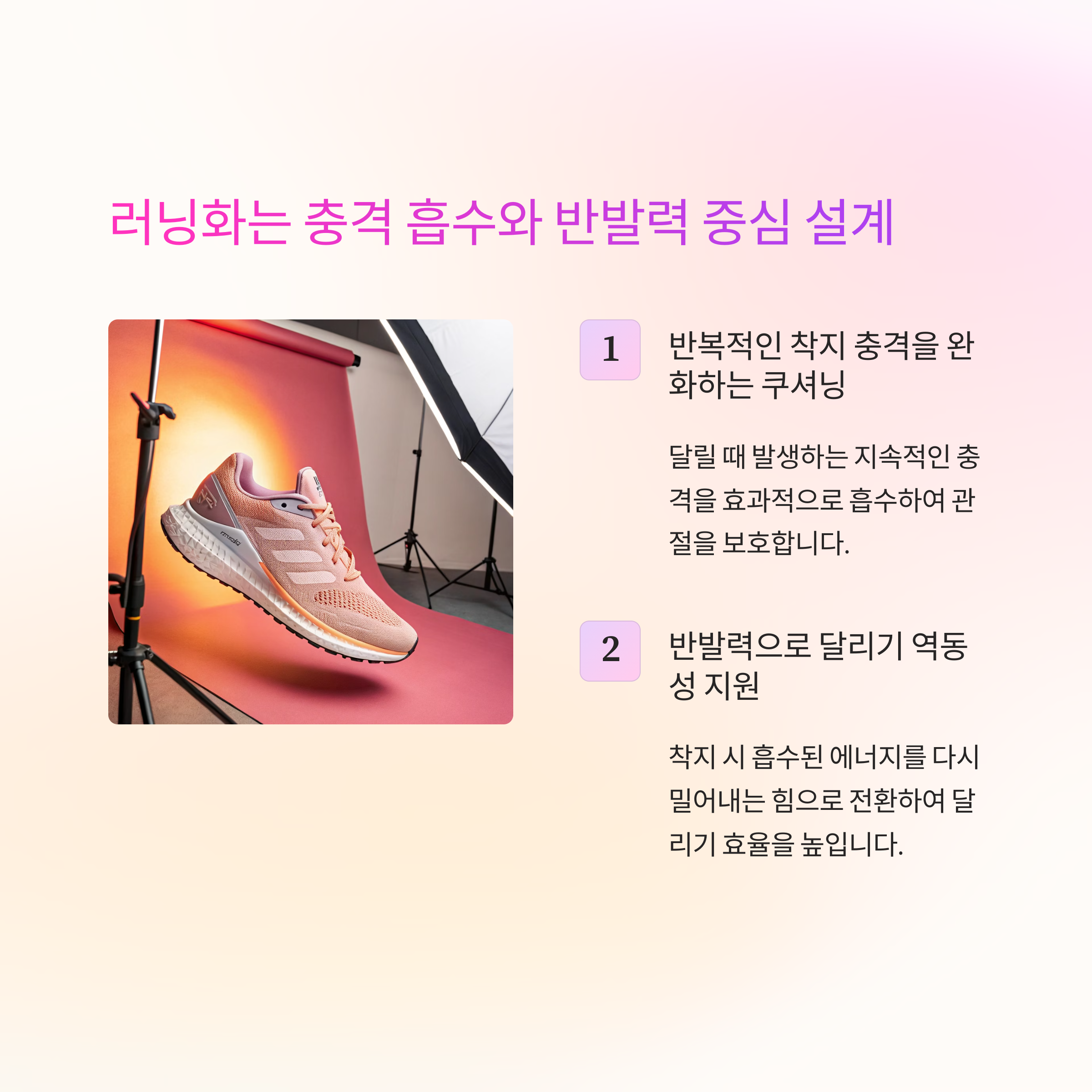 러닝은 발이 지면에서 완전히 떨어졌다가 착지하는 반복 동작이기 때문에 충격 흡수에 탁월한 쿠셔닝과 반발력이 중요합니다.