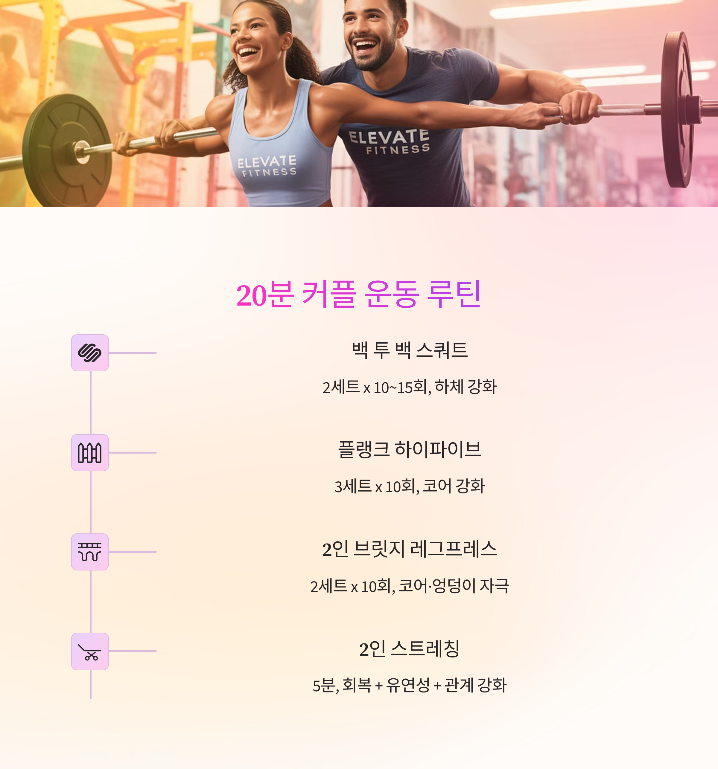 | 3 | 2인 브릿지 레그프레스 | 2세트 x 10회 | 코어·엉덩이 자극 + 협업 |