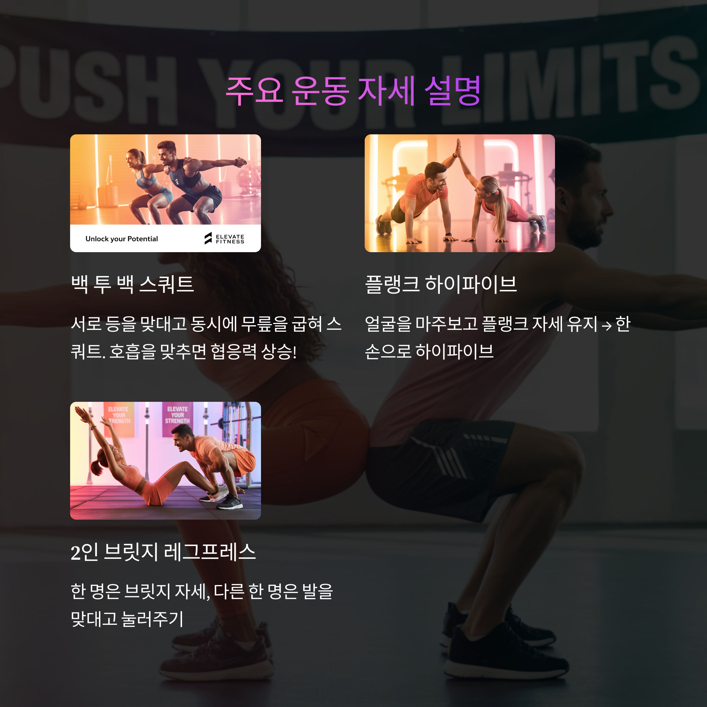 | 3 | 2인 브릿지 레그프레스 | 2세트 x 10회 | 코어·엉덩이 자극 + 협업 |