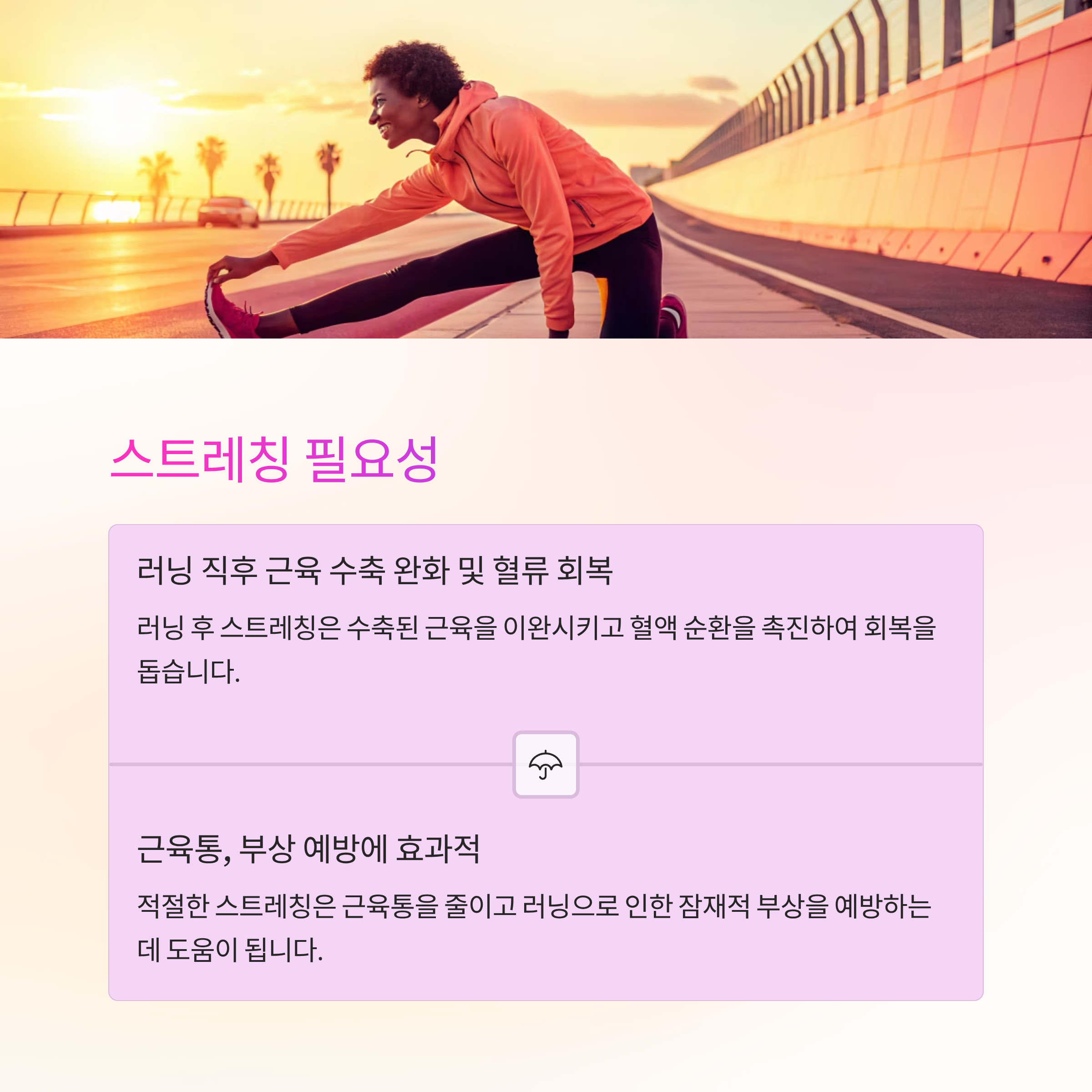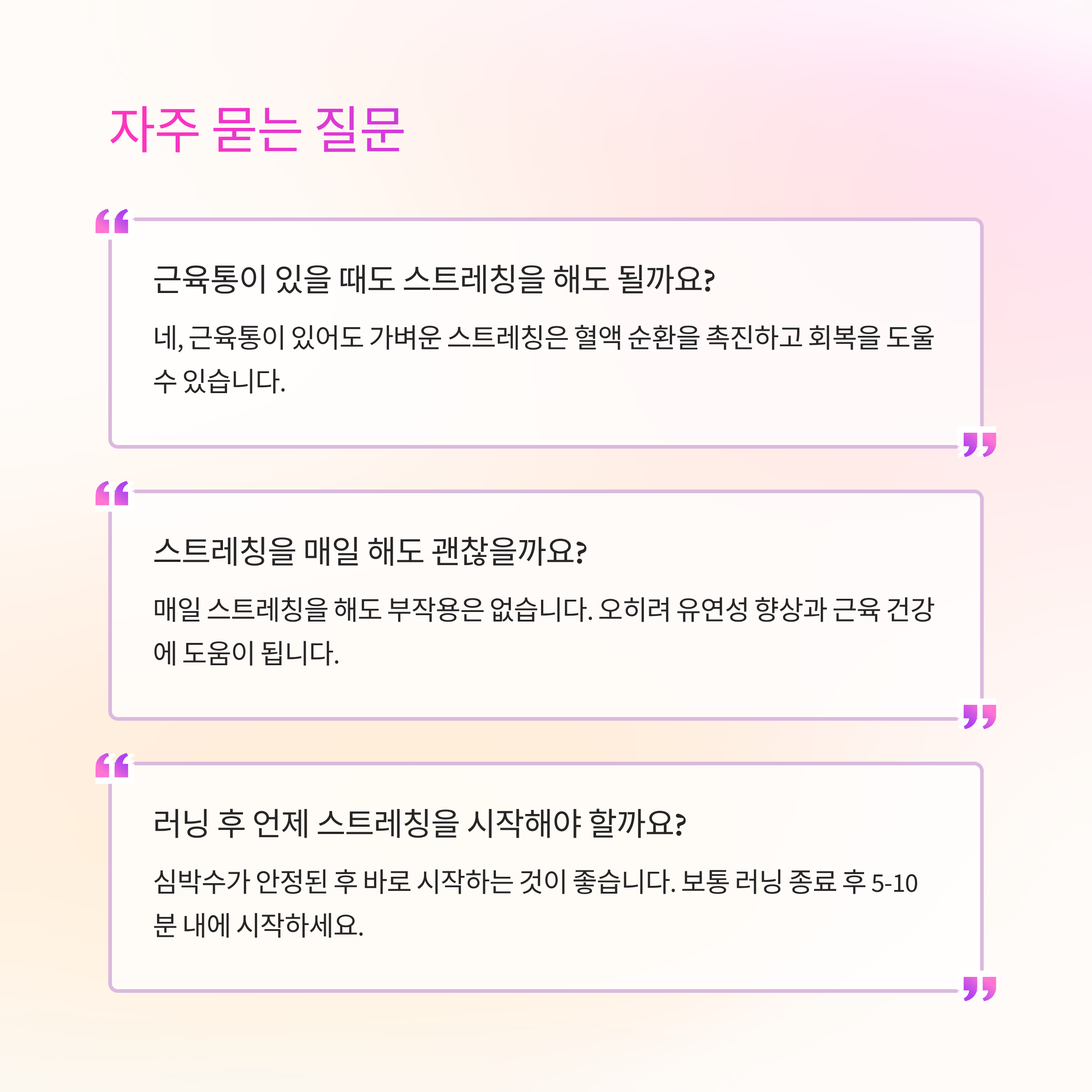 러닝은 스트레칭으로 완성됩니다. 5분의 회복 루틴이 근육통을 줄이고 부상을 막는 열쇠가 됩니다. 운동 직후 몸을 잠시 멈추고, 차분하게 몸을 풀어주는 시간을 꼭 가져보세요.