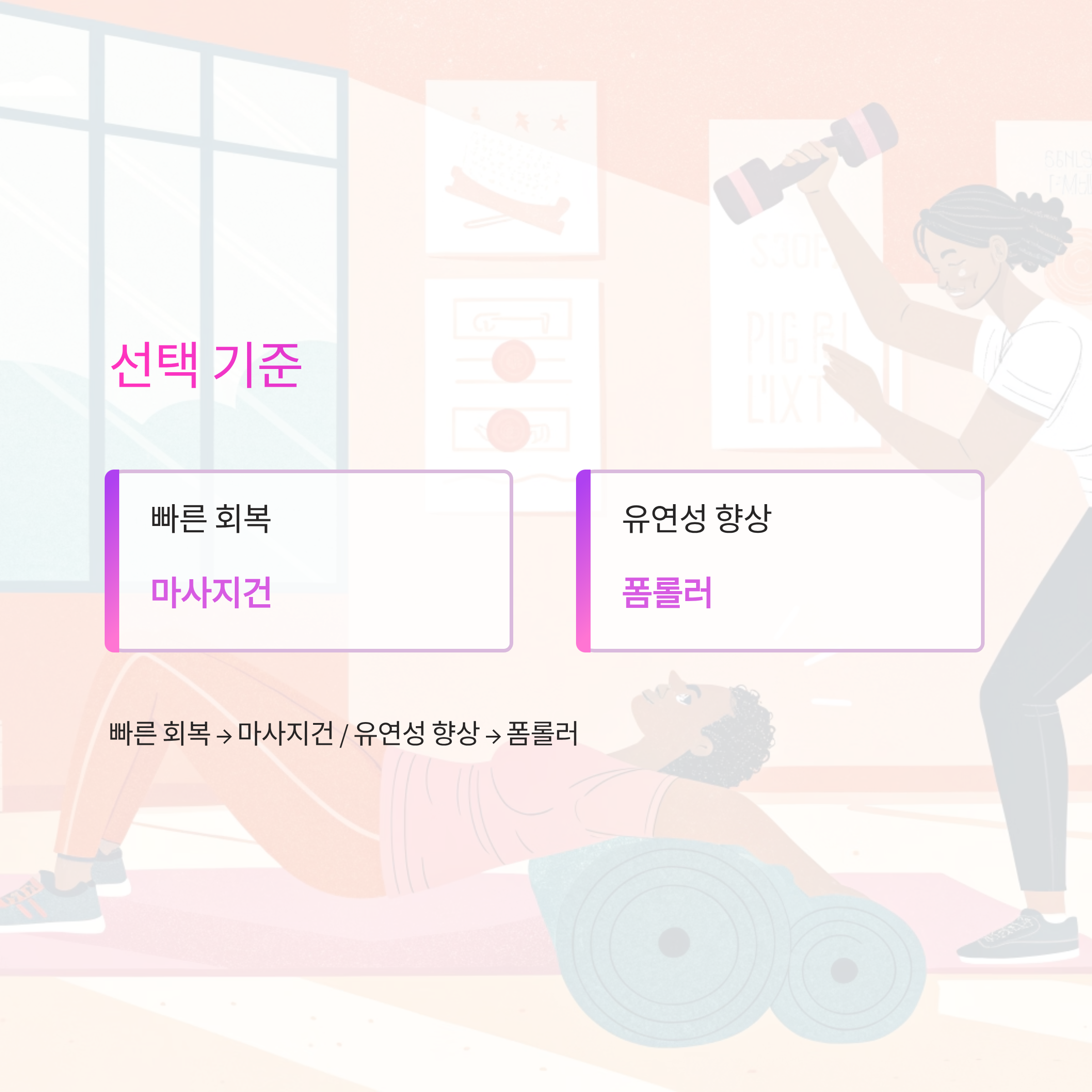 즉각적 시원함 → 마사지건 / 장기적 가동성 향상 → 폼롤러