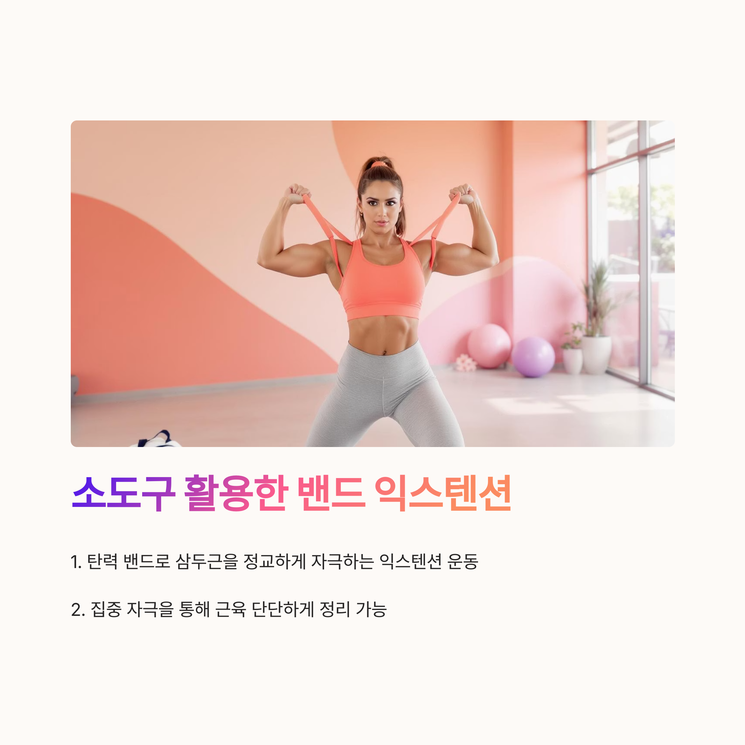 탄력 밴드를 활용한 익스텐션 동작은 팔 안쪽 군살 제거에 매우 효과적입니다.