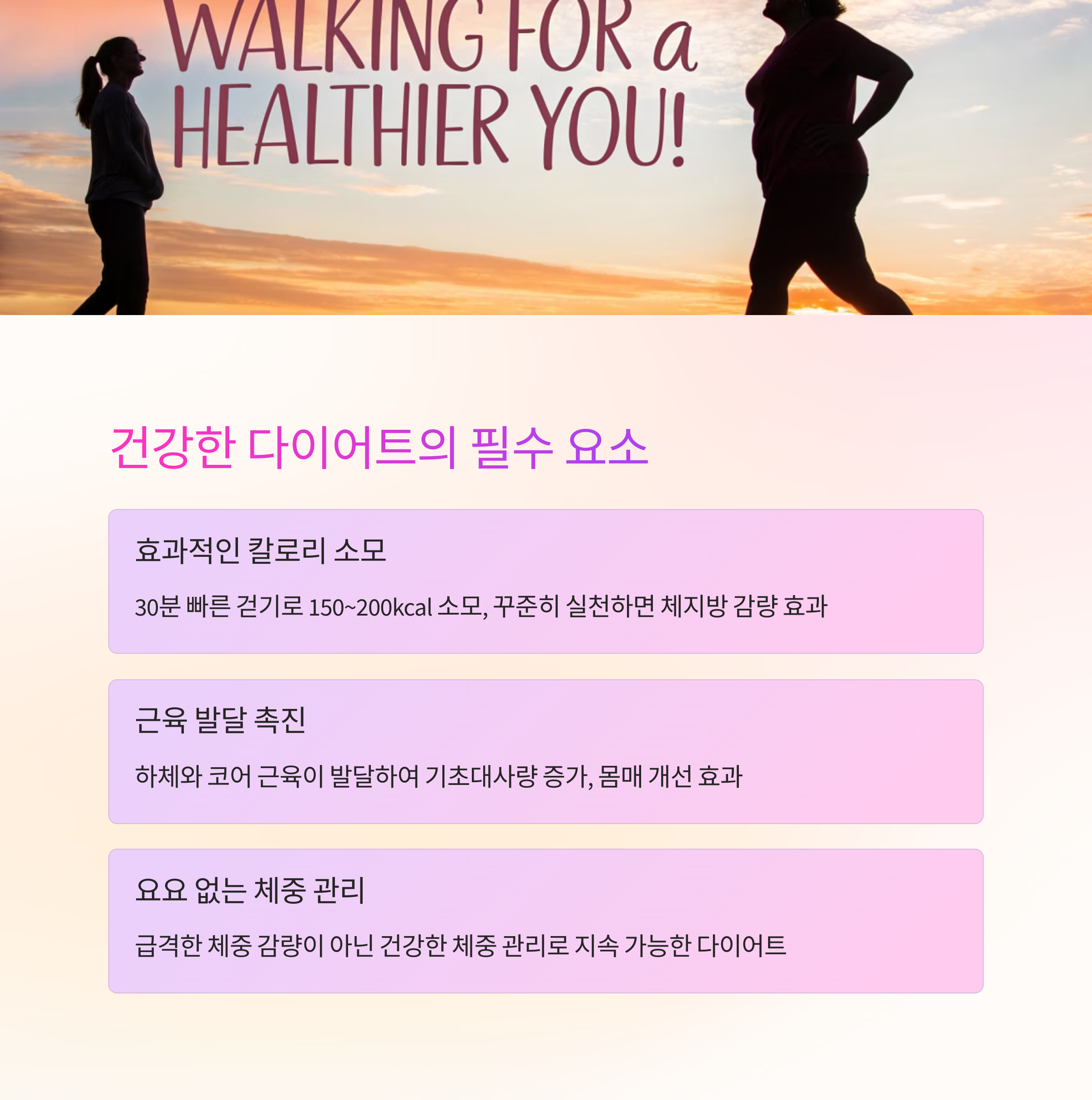 걷기는 특별한 장비 없이도 누구나 할 수 있는 최고의 유산소 운동입니다.