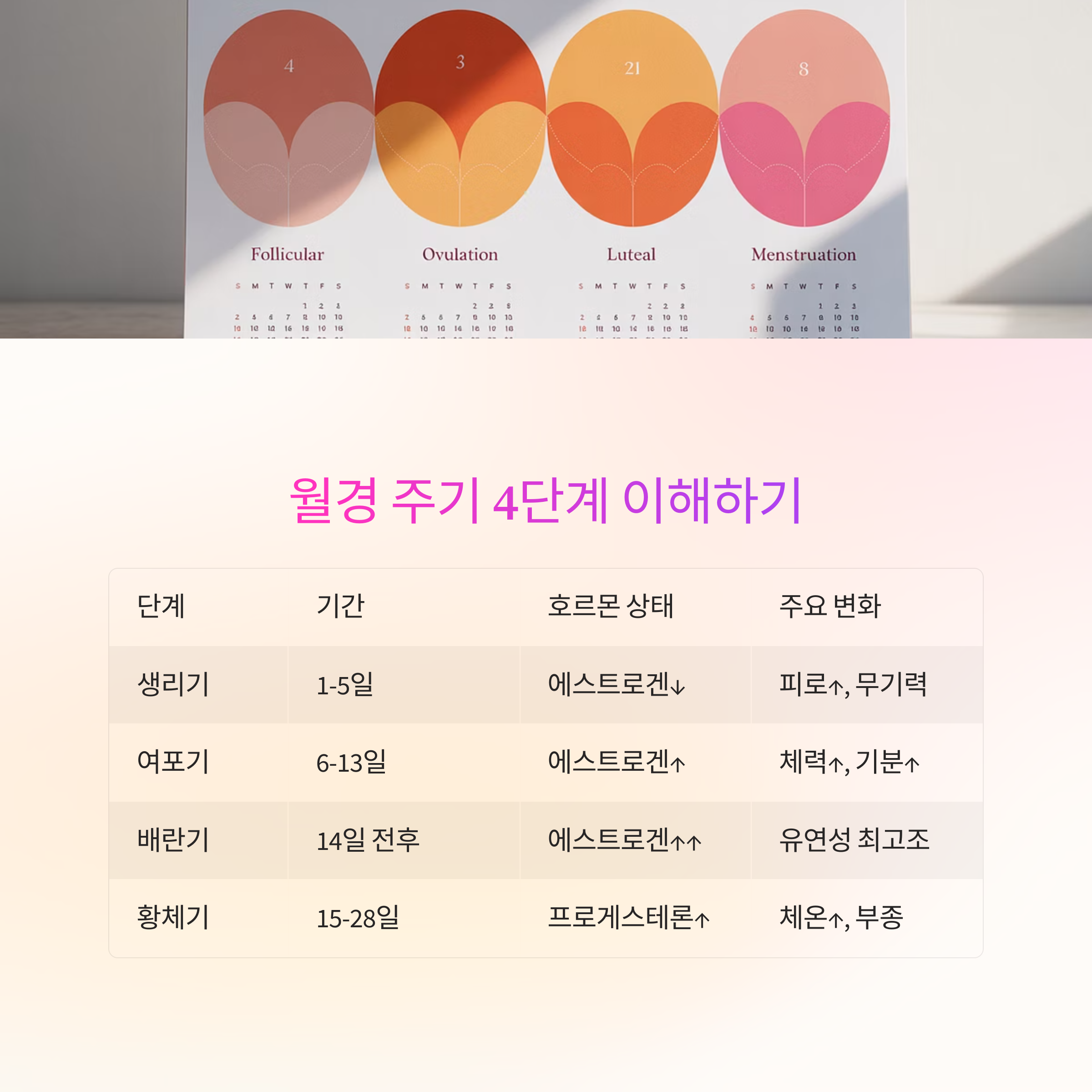 | 황체기 | 15~28일 | 프로게스테론↑ | 체온↑, 부종, 피로, 감정 기복 |