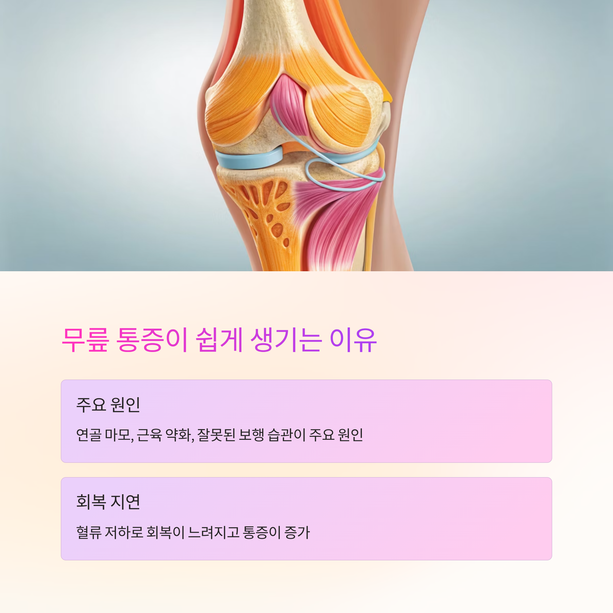 관절은 혈액 공급이 적은 부위입니다. 혈류가 줄면 회복이 느려지고 통증이 악화됩니다.