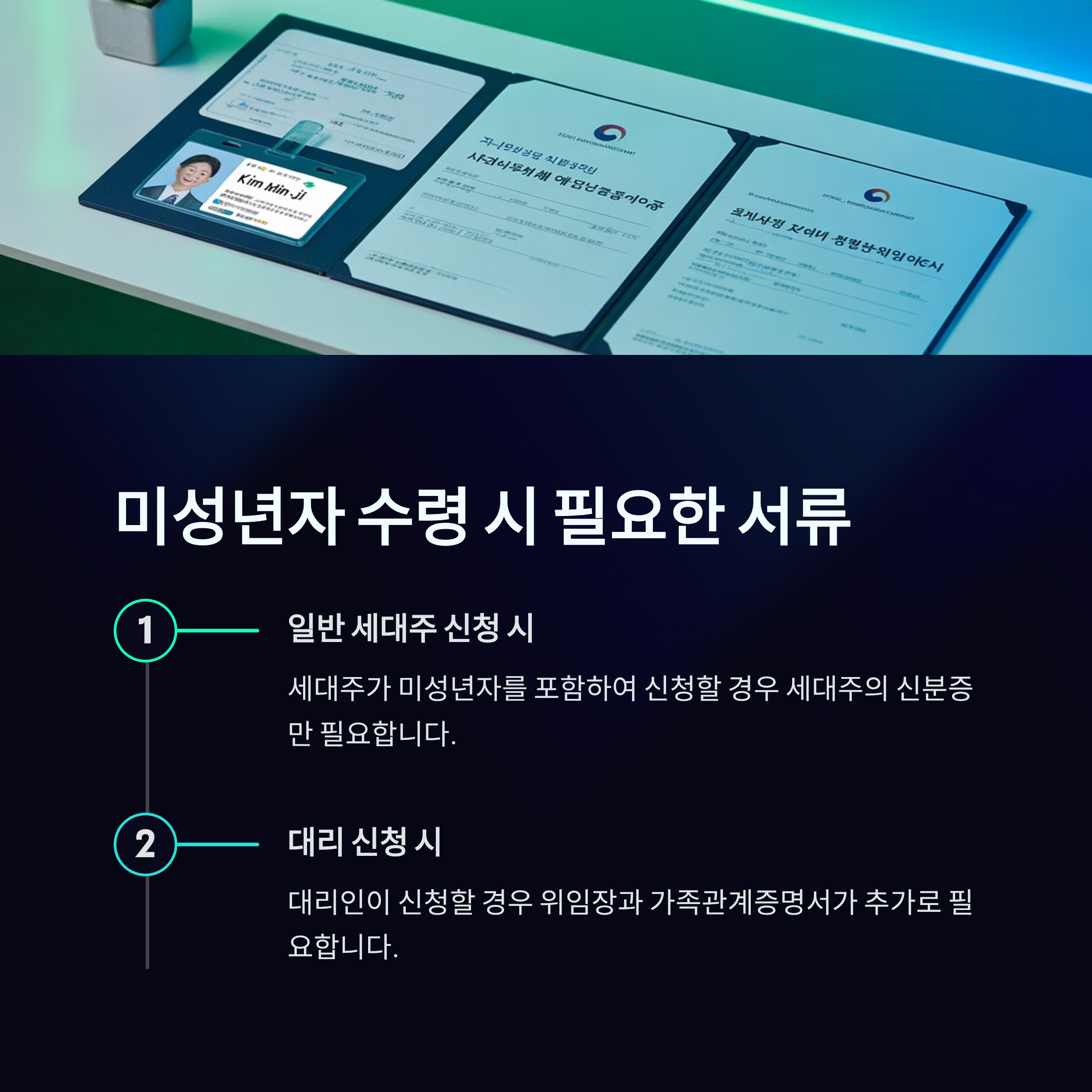 미성년 세대주가 직접 신청 시: 본인 확인이 가능한 학생증, 청소년증 또는 주민등록증(있다면) 필요하며, 주민센터에서 직접 접수 가능합니다.