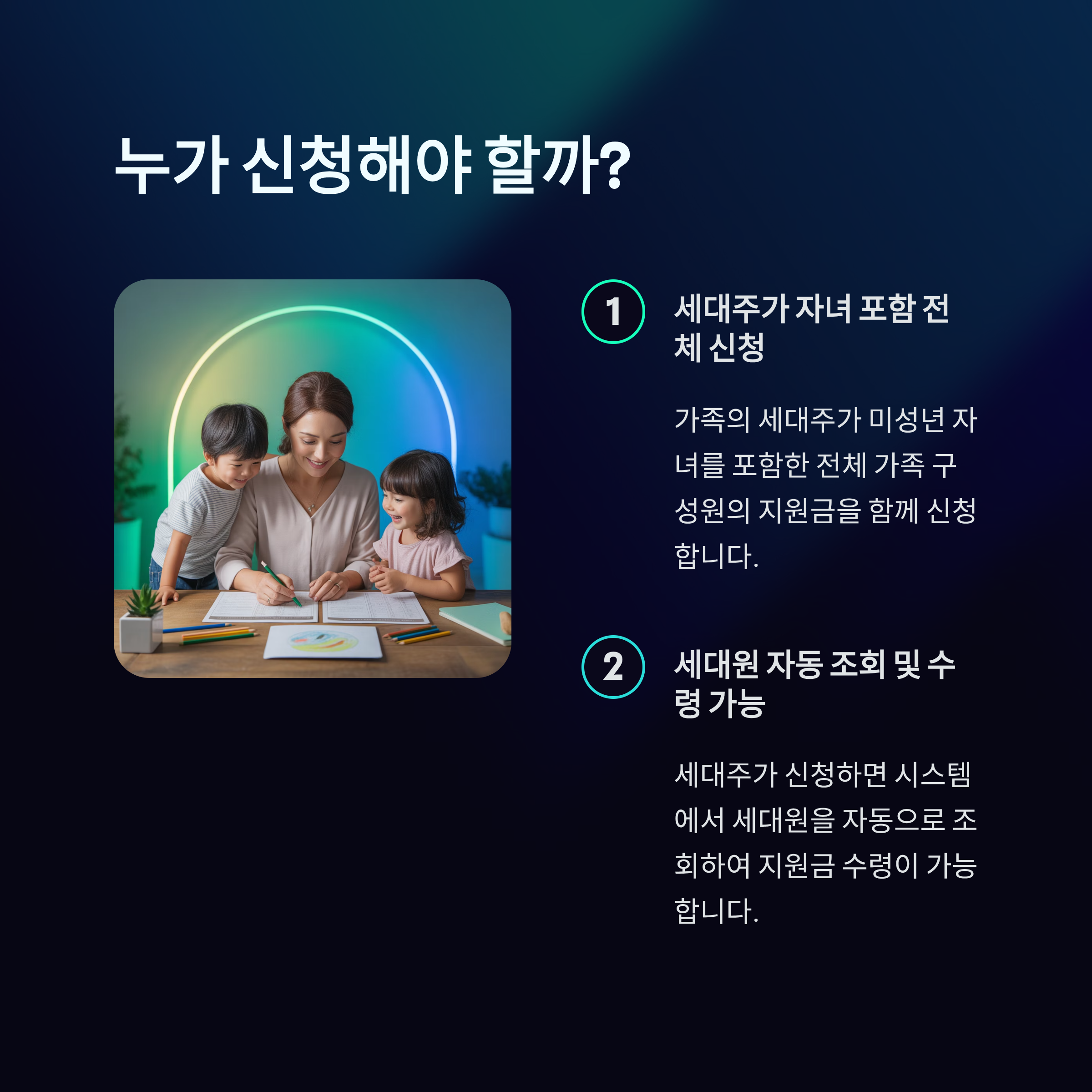 대부분의 경우, 세대주가 가족 구성원의 몫까지 함께 신청합니다. 자녀가 미성년자일 경우 직접 신청은 불가능하며, 부모나 보호자가 세대주라면 본인의 카드사 앱 또는 지자체 시스템을 통해 자녀 포함 신청이 가능합니다. 한 번의 절차로 세대원 전체의 지원금 조회 및 선택 수령이 가능하며, 카드 포인트 형태 또는 모바일 상품권 등으로 지급됩니다.