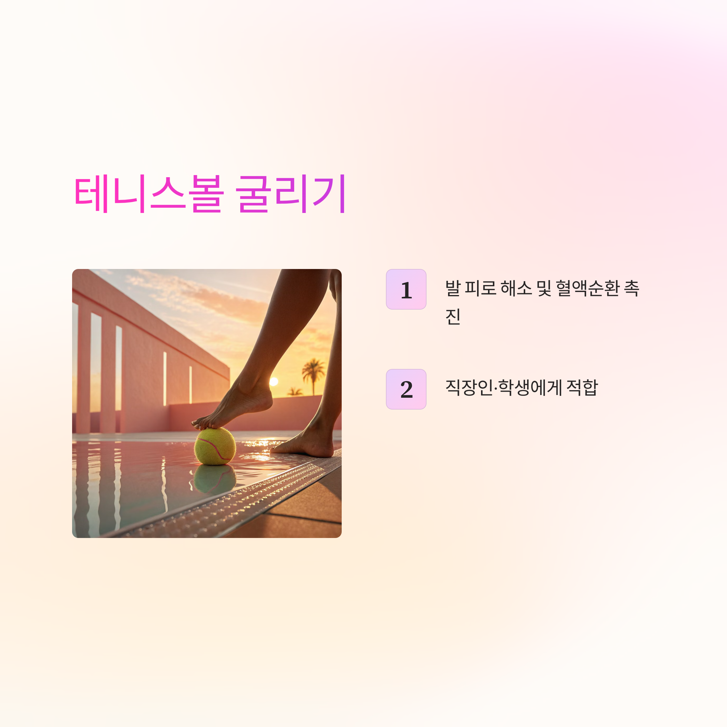 테니스볼이나 마사지볼을 발바닥 아래에 두고 앞뒤로 굴립니다. 이는 단순한 마사지 효과를 넘어, 근막을 이완시키고 혈액순환을 촉진해 발 건강에 도움을 줍니다. 하루 5분만 해도 발 피로가 크게 줄고, 근육 강화 효과가 서서히 쌓입니다. 장시간 서서 일하는 직장인이나 학생들에게 특히 추천되는 방법입니다.
