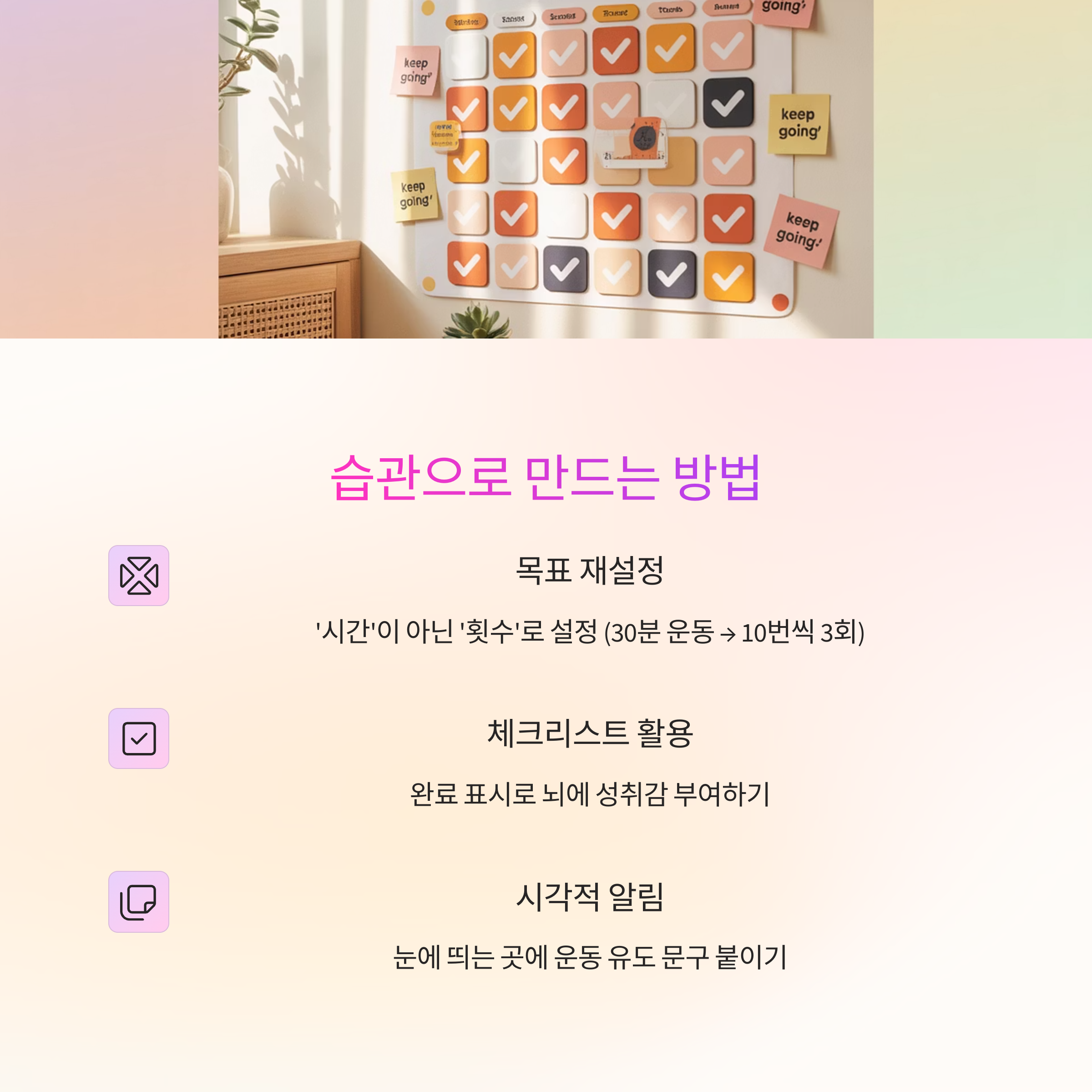 | 붙이기 | 기존 습관에 운동을 붙인다 (ex. 양치 → 스쿼트 10회) |