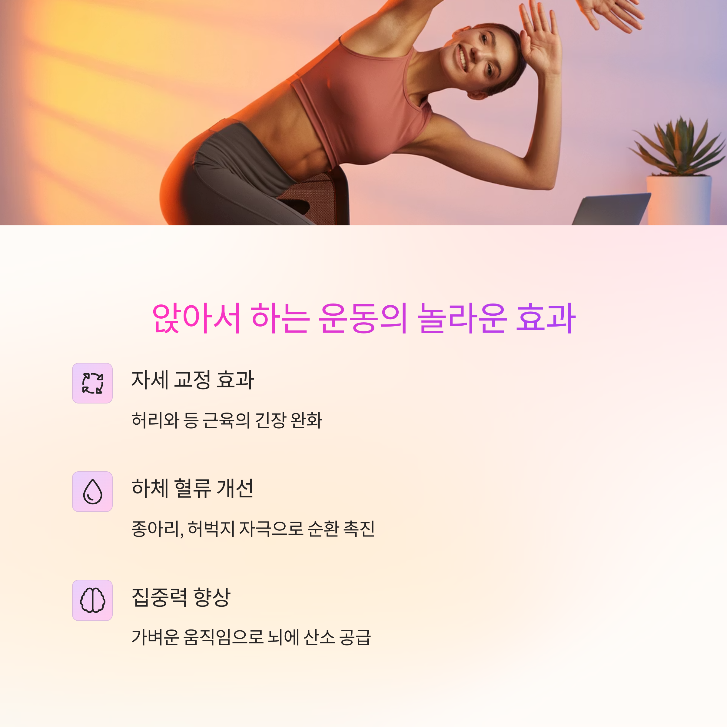 오랜 시간 앉아서 일하면 혈액순환 저하, 어깨·목 통증, 집중력 저하 등이 쉽게 찾아옵니다.