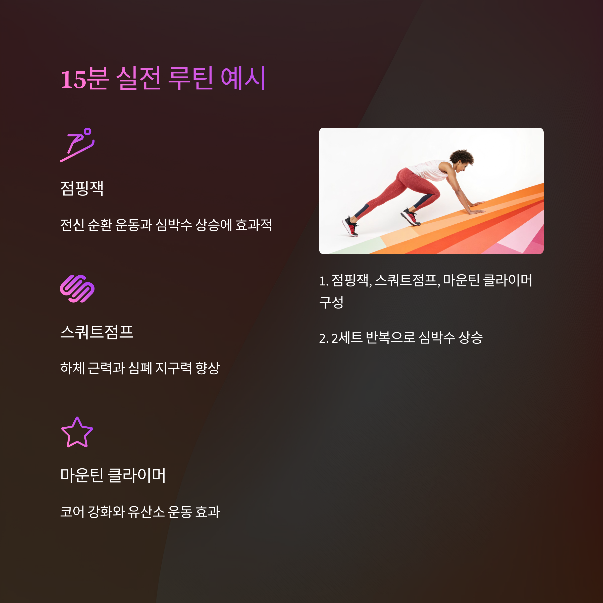 15분이라는 시간은 바쁜 일상 중 잠깐의 여유로도 충분히 만들 수 있습니다. 게다가 이 시간 동안 고강도 인터벌 방식(HIIT)으로 집중하면, 체지방 연소, 근력 자극, 심폐지구력 향상이 모두 가능해지죠. 1시간 헬스장보다 집에서 15분 집중 운동이 더 효율적일 수 있습니다. 짧지만 정확하고 강한 루틴이 관건입니다.