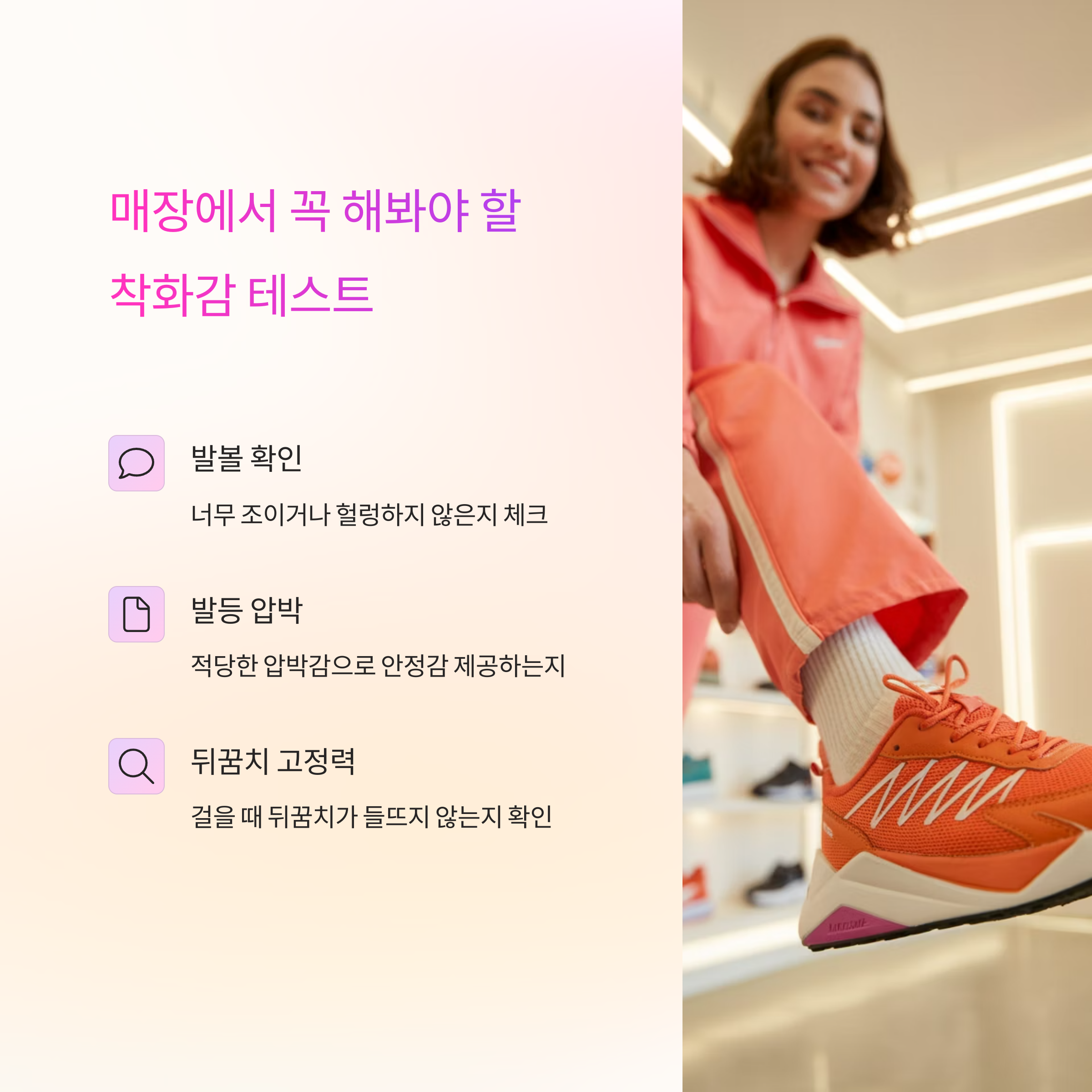 | 착화감 | 뒤꿈치 뜸, 발볼 압박 없는지 확인 |