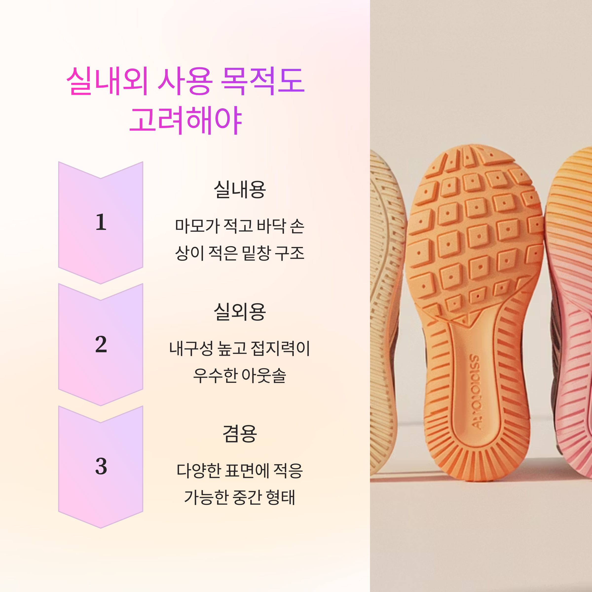 | 러닝 | 충격 흡수, 경량성 | 부드러운 쿠션 + 유연한 갑피 |