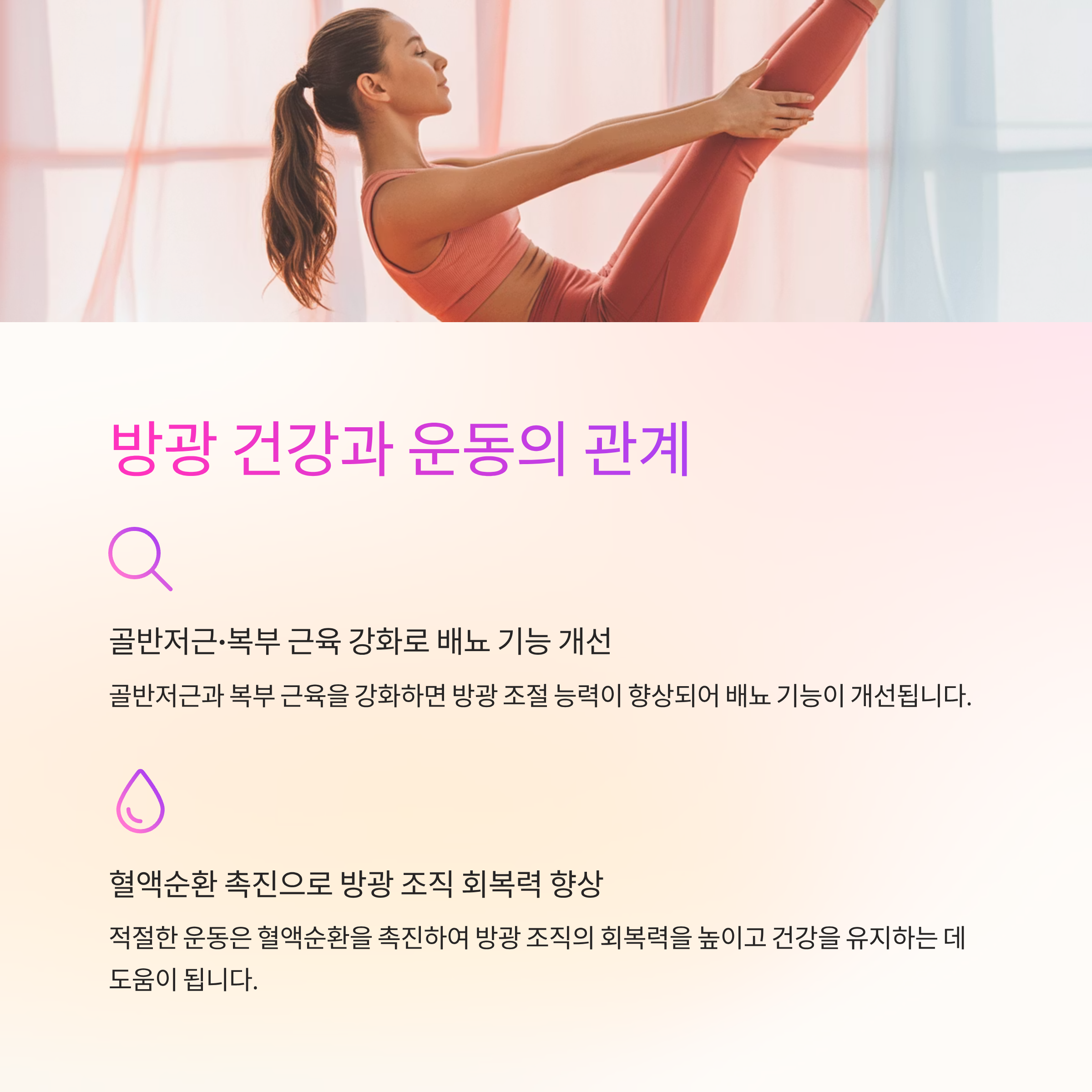 방광 건강은 골반저근 강화, 코어 안정성, 유산소 운동, 스트레칭, 생활습관 관리가 함께 이루어져야 합니다. 작은 습관 변화와 규칙적인 운동만으로도 배뇨 건강을 지킬 수 있습니다.