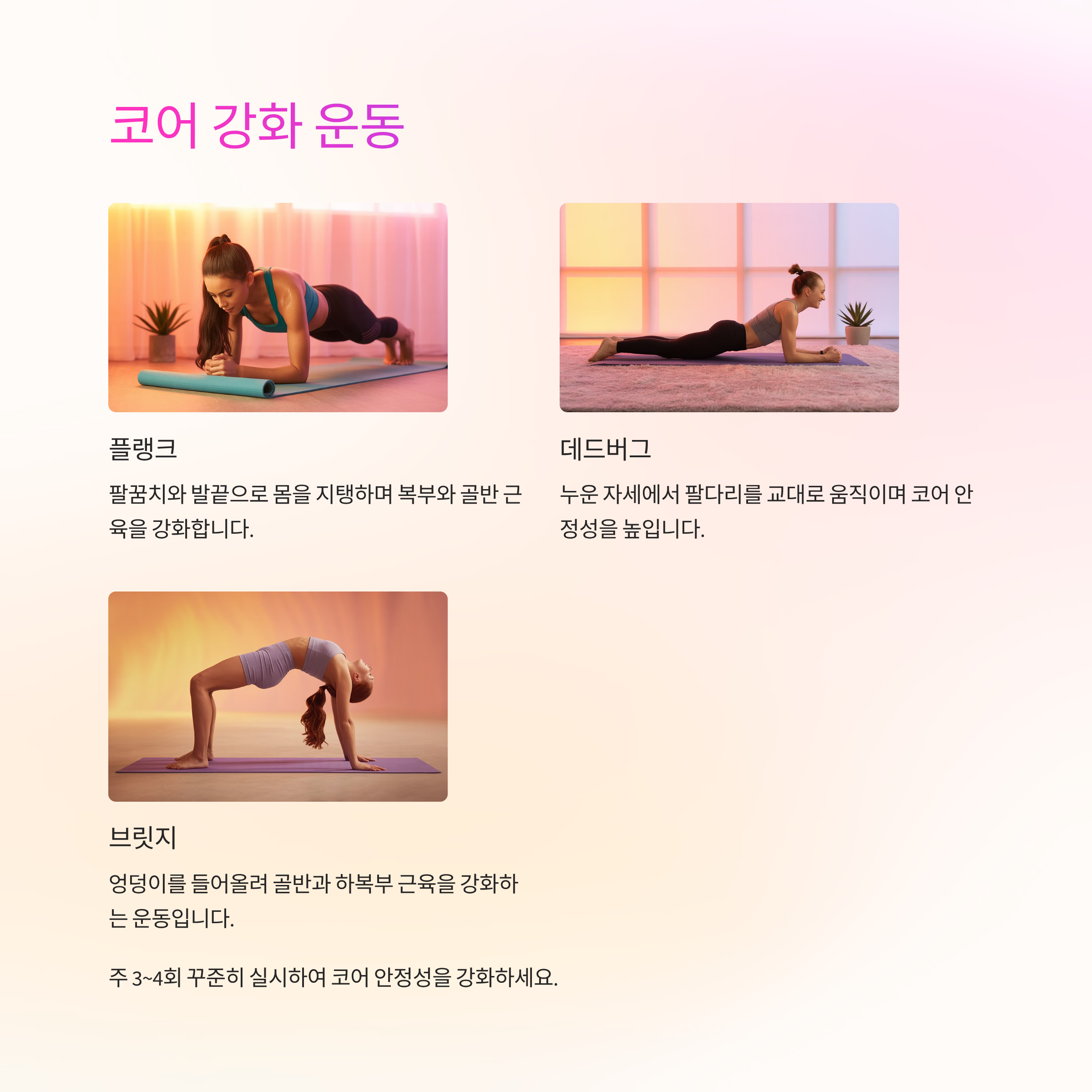 코어 근육은 방광과 골반저근을 지지하는 ‘기둥’ 역할을 합니다. 플랭크, 데드버그, 브릿지 같은 운동은 방광 건강에도 효과적입니다.