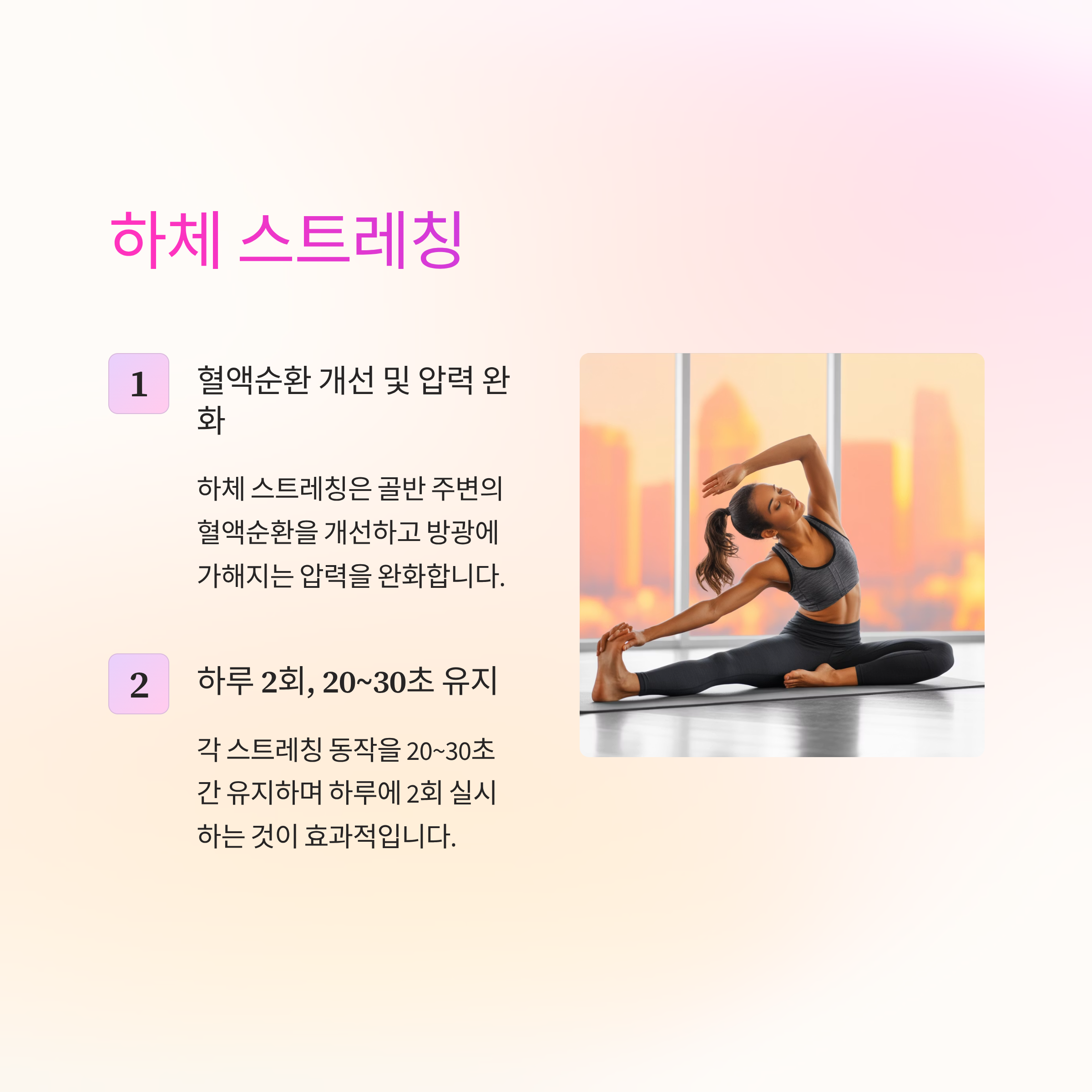 하체 스트레칭은 혈액순환 개선과 골반 주변 근육 이완에 도움을 줍니다. 방광에 가해지는 압력을 줄이고, 운동 후 회복 속도를 높입니다.
