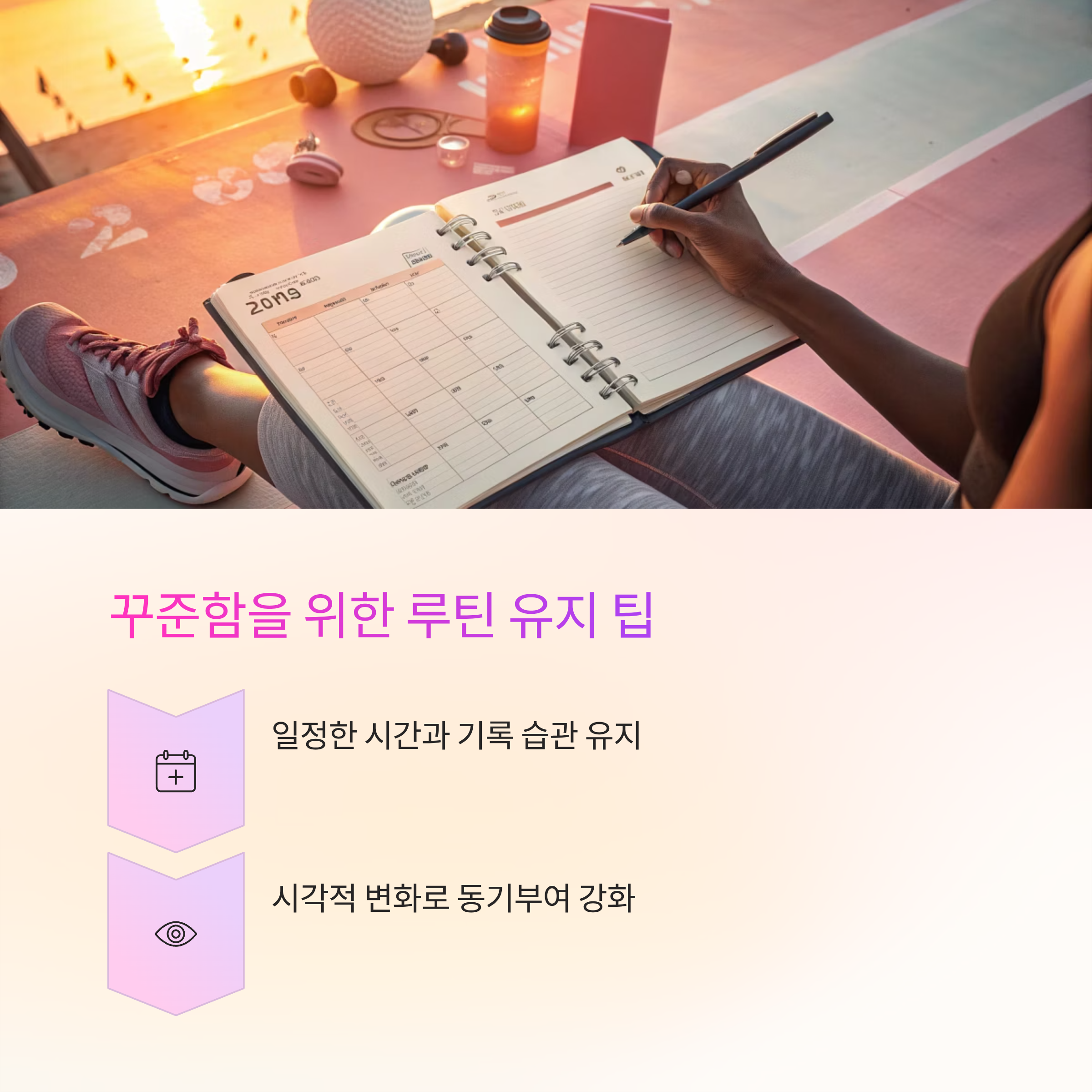 꾸준함은 의지보다 환경이 만듭니다. 운동하기 쉬운 시간과 공간을 미리 세팅해 두세요.